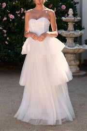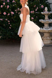 This refined wedding gown combines architectural elements with ethereal design. The sweetheart neckline creates a timeless frame that elegantly highlights the décolletage, while the strapless bodice offers clean lines with sophisticated simplicity. The empire waistline sits just below the bust, creating an elongated silhouette that enhances proportion and comfort. Multiple tiers of diaphanous tulle cascade from the defined waist, creating dimensional volume and captivating movement. The A-line construction ensures the tiered layers maintain structural integrity while appearing weightless. This thoughtfully crafted gown balances classical bridal elements with contemporary styling for a sophisticated yet romantic aesthetic.