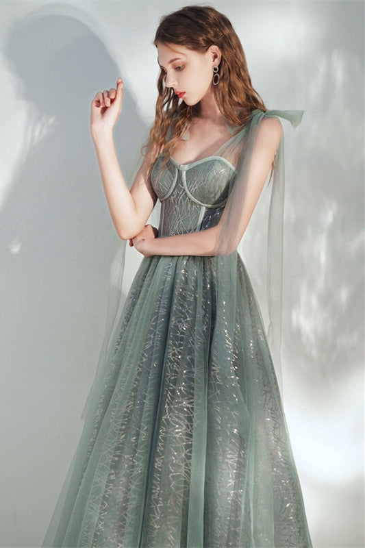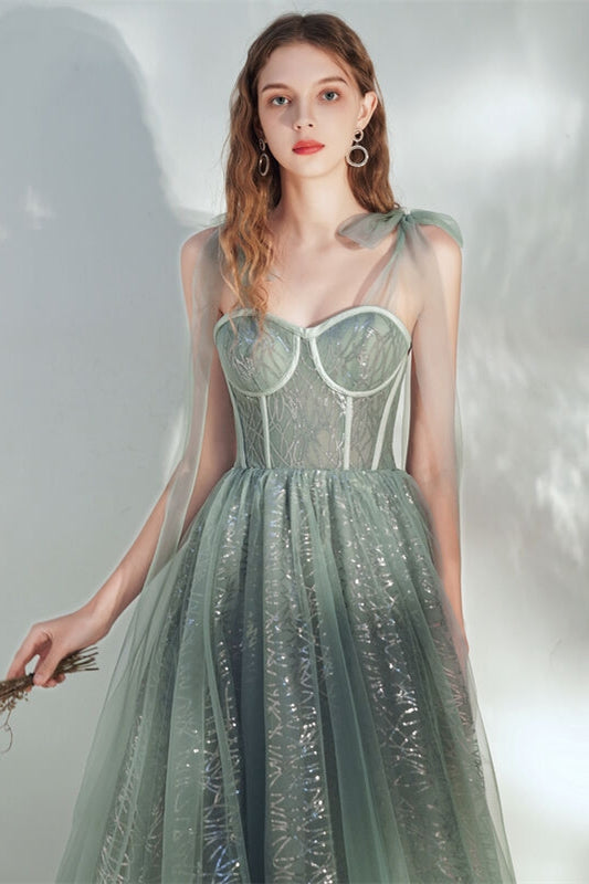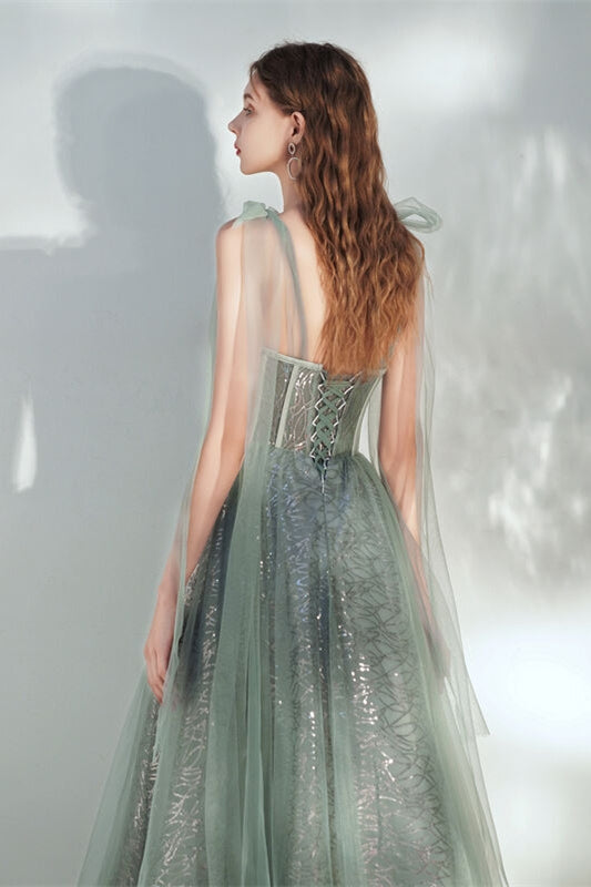 Joyofdress This dress features a sweetheart neckline with sheer straps bow tie on the shoulder, a corset bodice with boning inside and lace-up back detail, and a gathering ankle-length skirt.