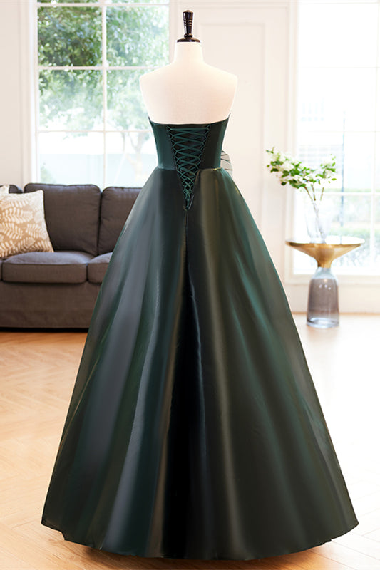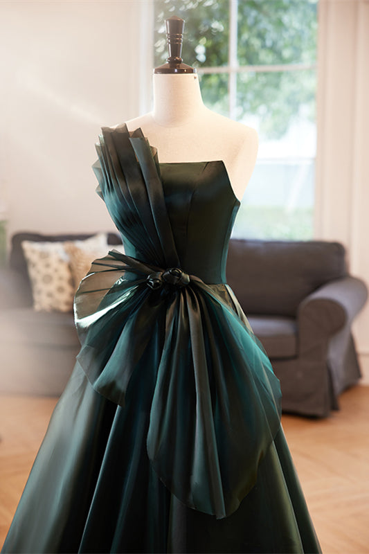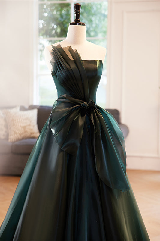 Dark Green Strapless Pleated Maxi Formal Dress with Bow