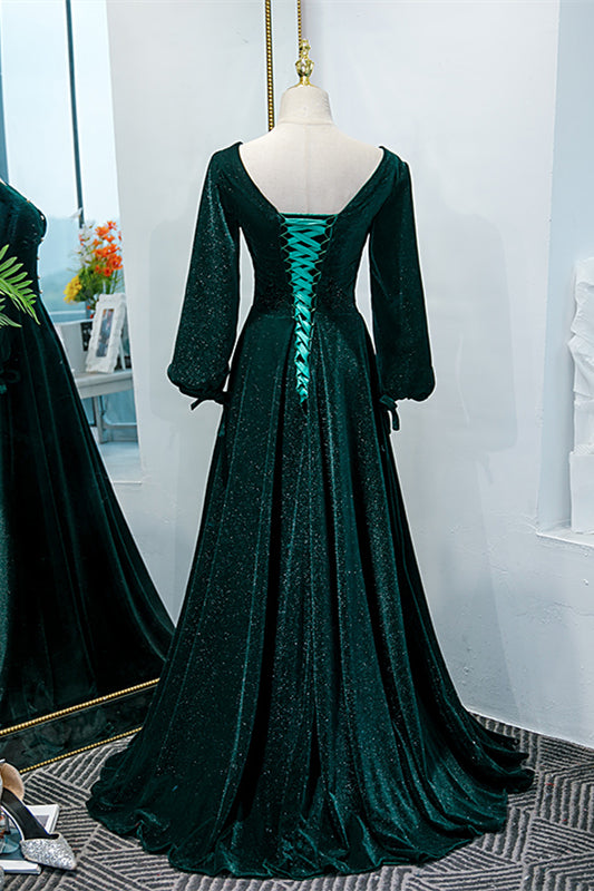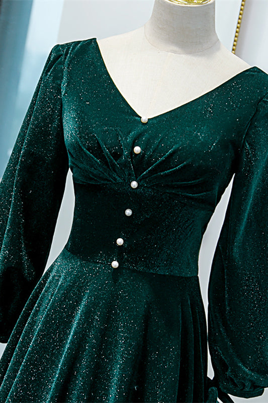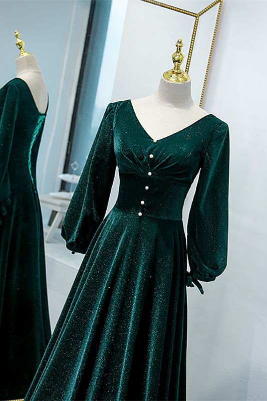 Dark Green V Neck Long Sleeves Velvet Long Formal Dress with Pearl Button