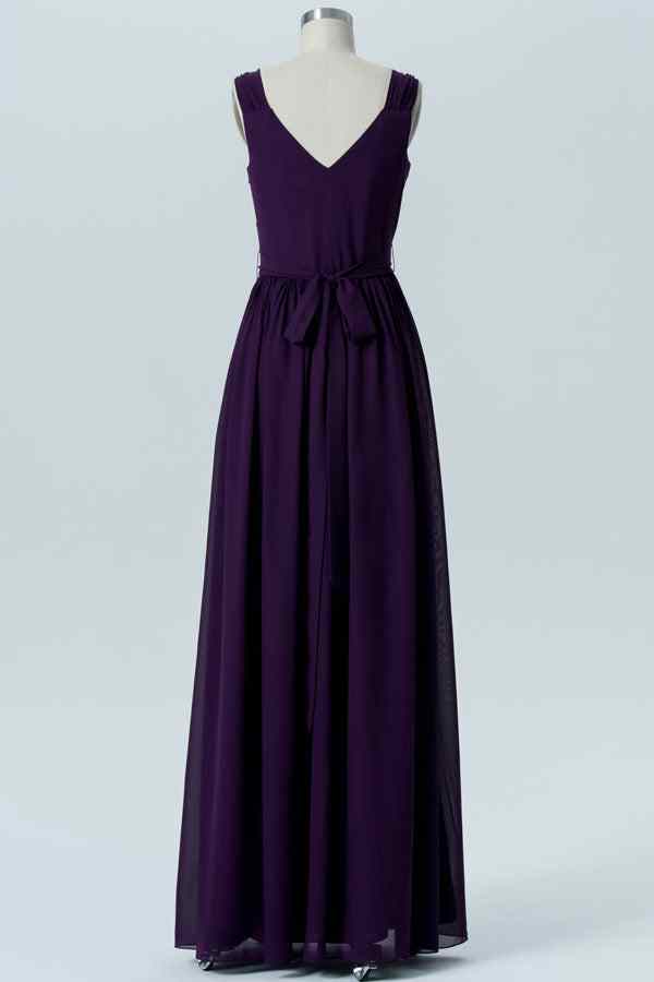Dark Purple A-line V Neck Pleated Chiffon Long Bridesmaid Dress