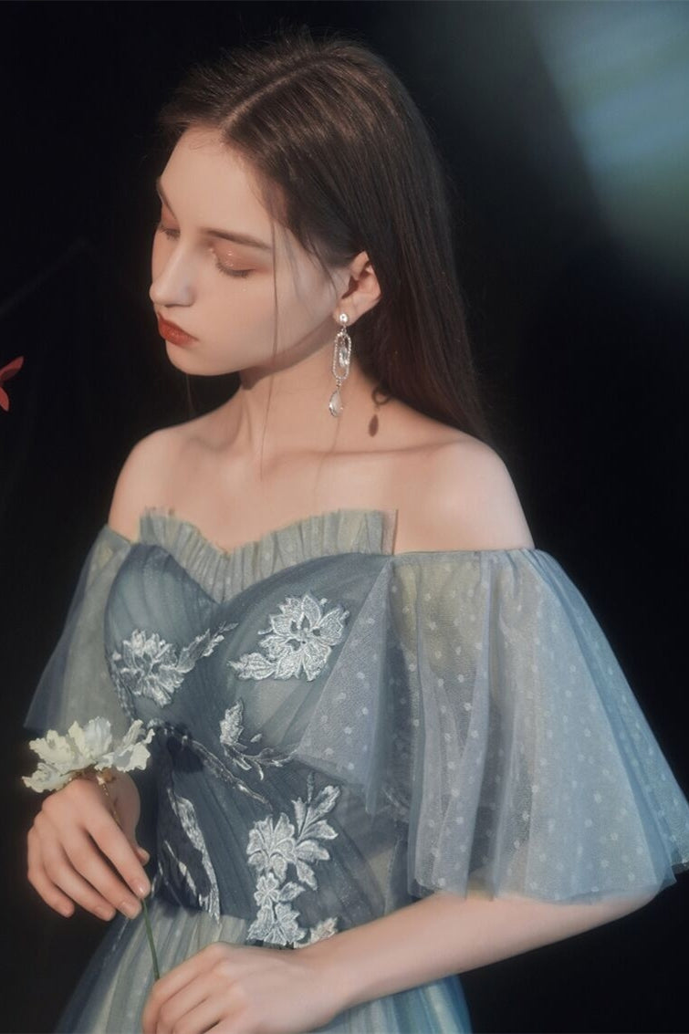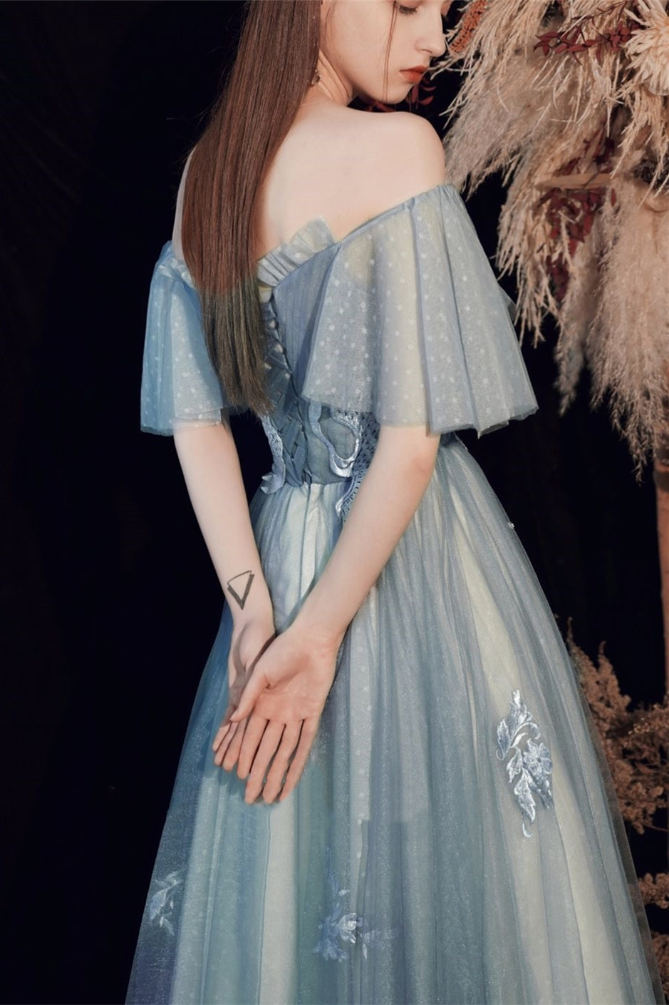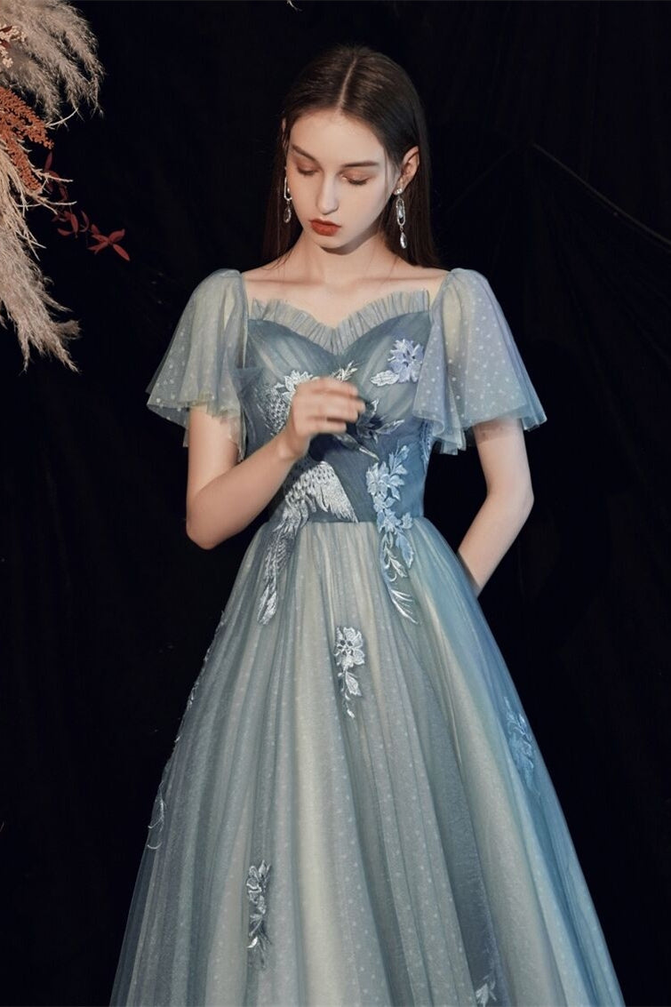 Joyofdress princess A-line dusty blue tulle long prom dress features flutter sleeves and white Polk dots. Joyofdress offers 15% Off with code: JOY10 for over $200 shopping. You can get the coupon with our bras.