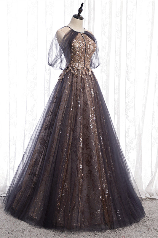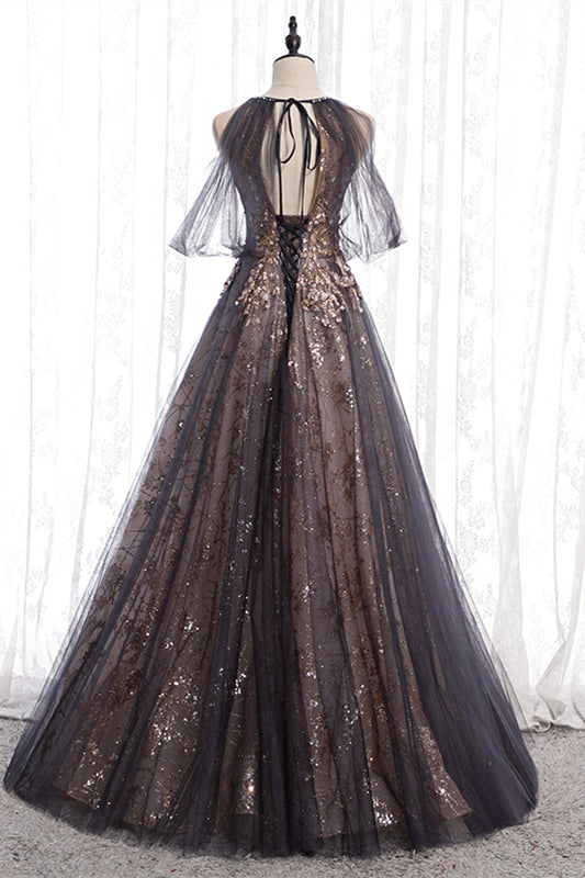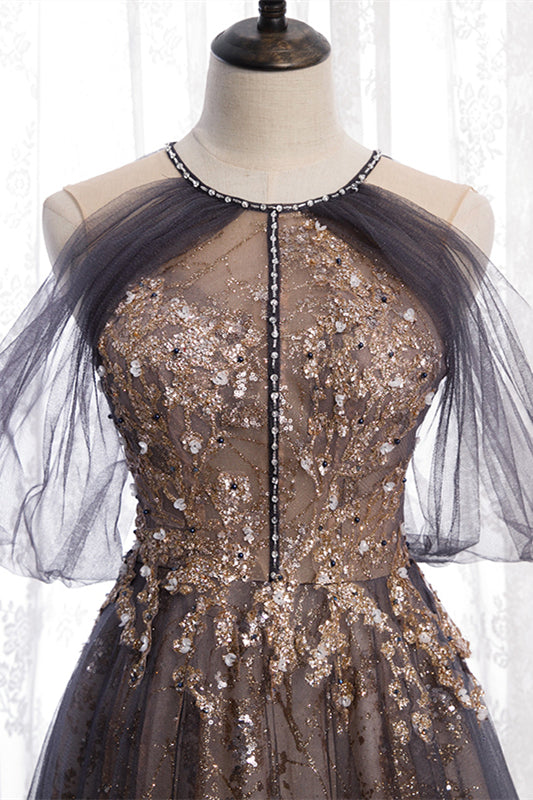 Joyofdress this A-line silhouette dress features a jewel-high neckline with an illusion off-the-shoulder neckline, a bow tie back detail with a lace-up back, a corset bodice with gold beaded floral embroidered appliques flowing down to the hemline, and the look is complete with the floor length with flare at the hemline.