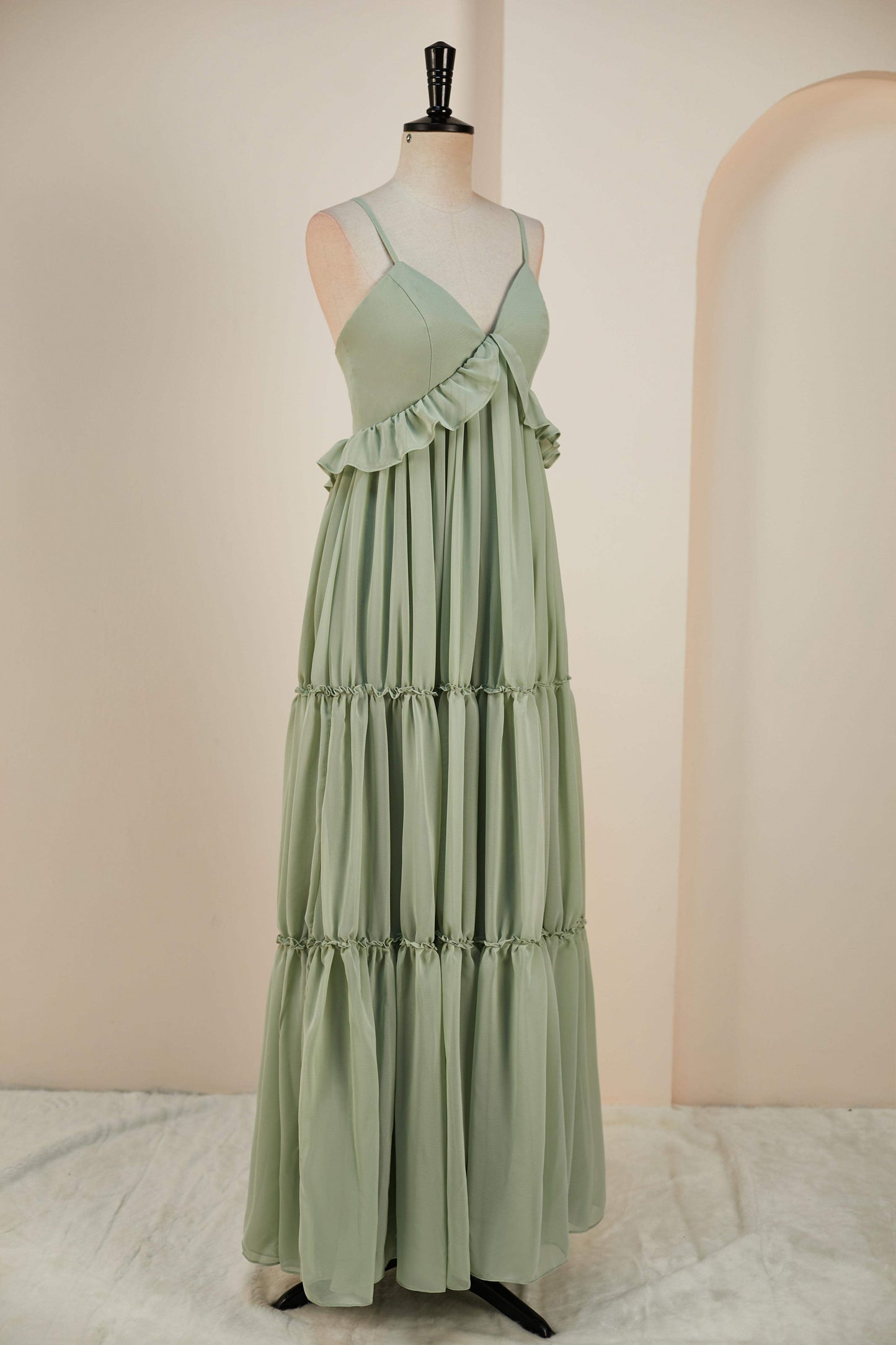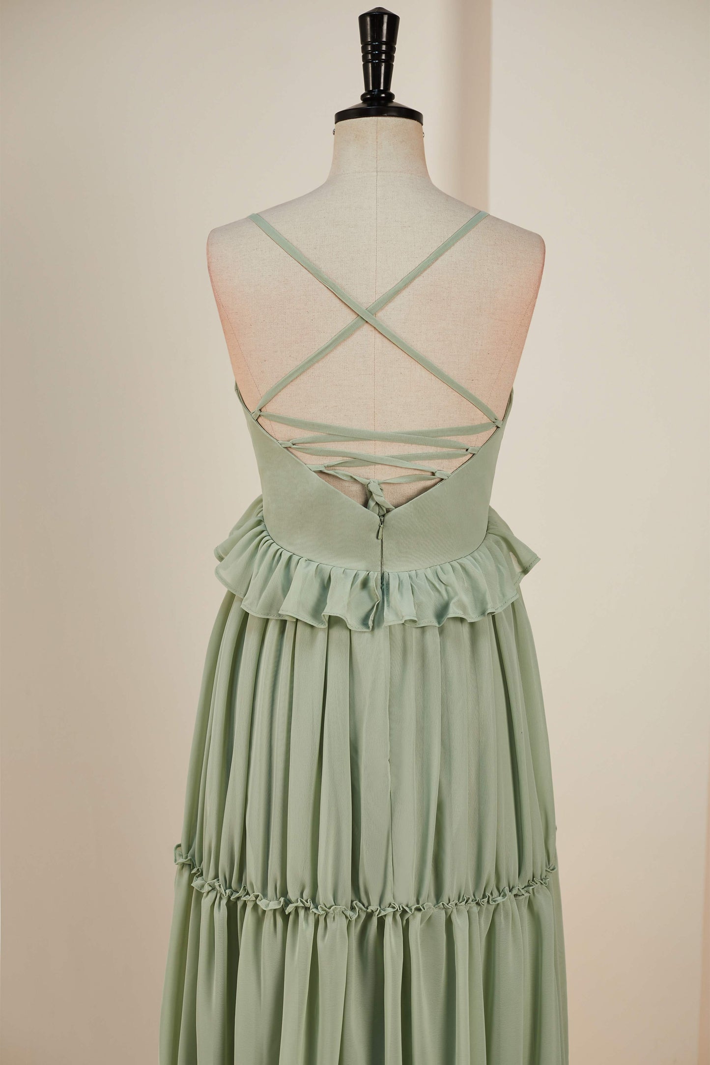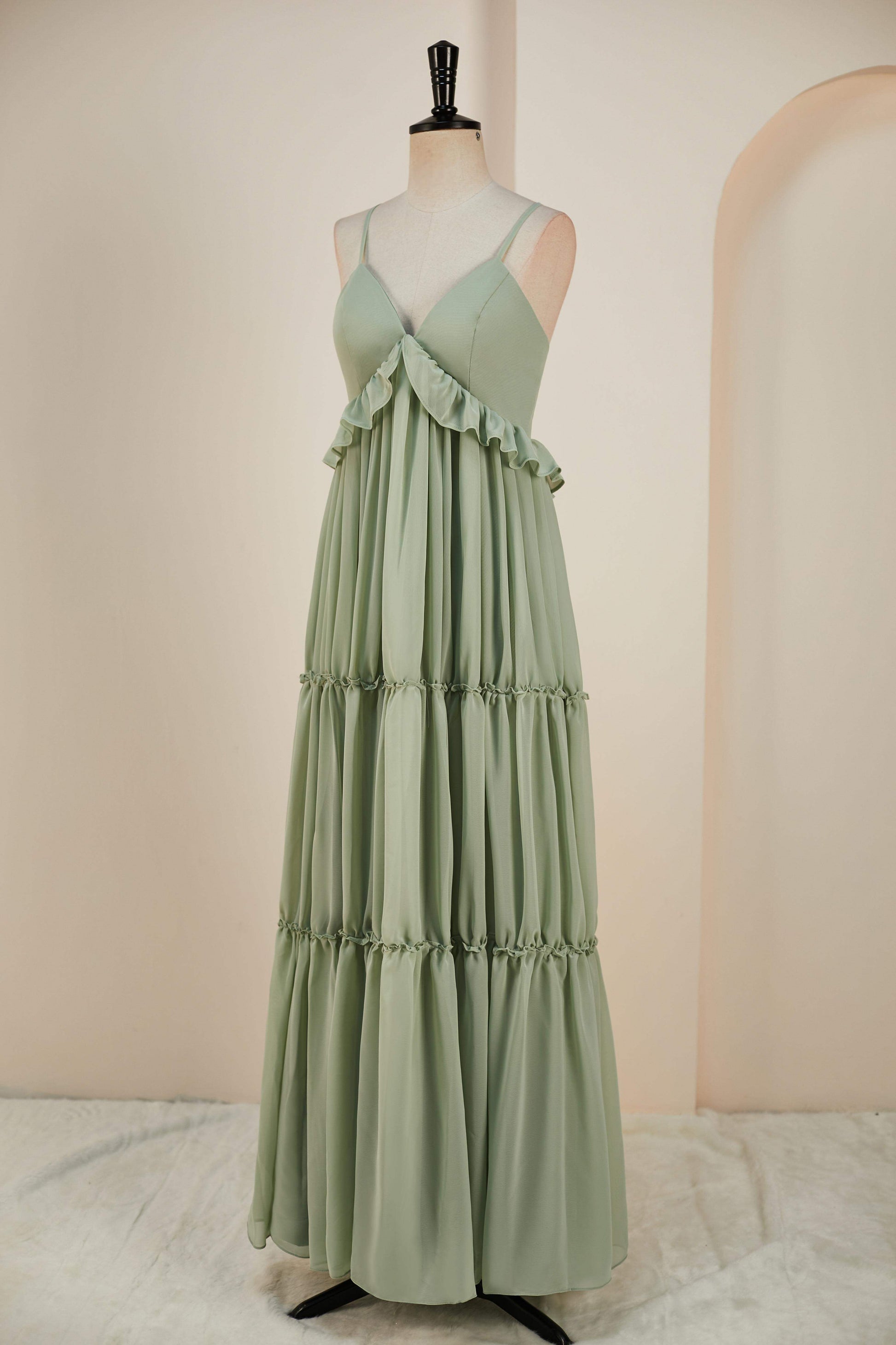 This dusty sage bridesmaid dress features a plunging V neckline with spaghetti straps which create a lace-up back detail, and an empire silhouette with ruffled top bodice, and a floor-length skirt with ruffled layers.