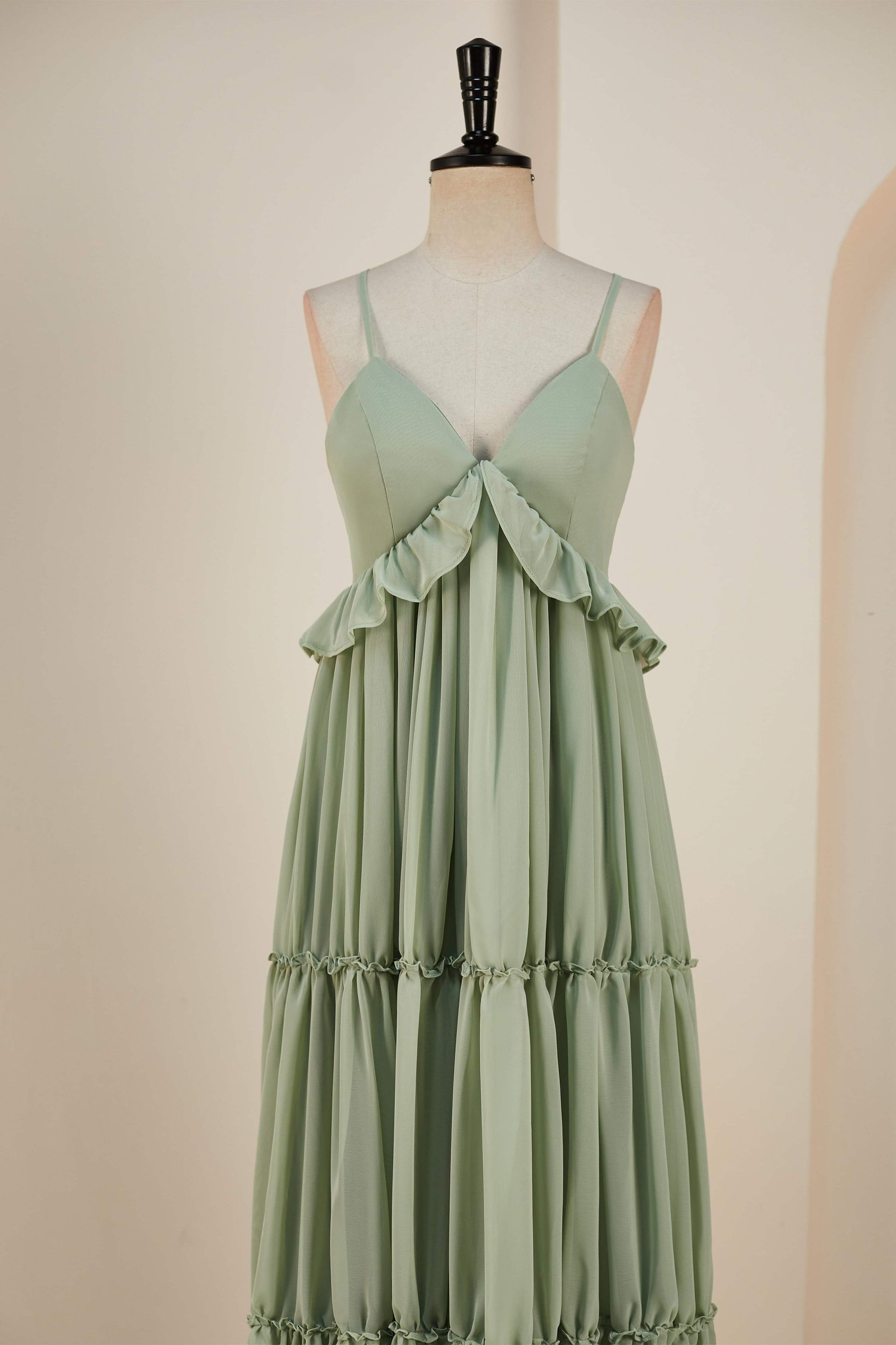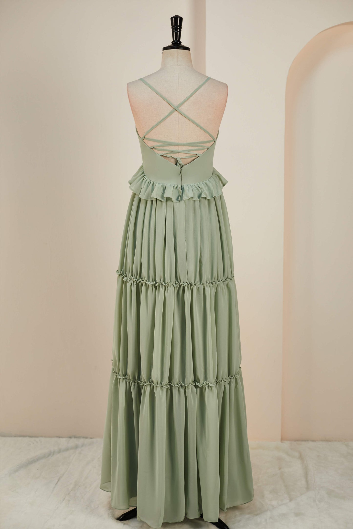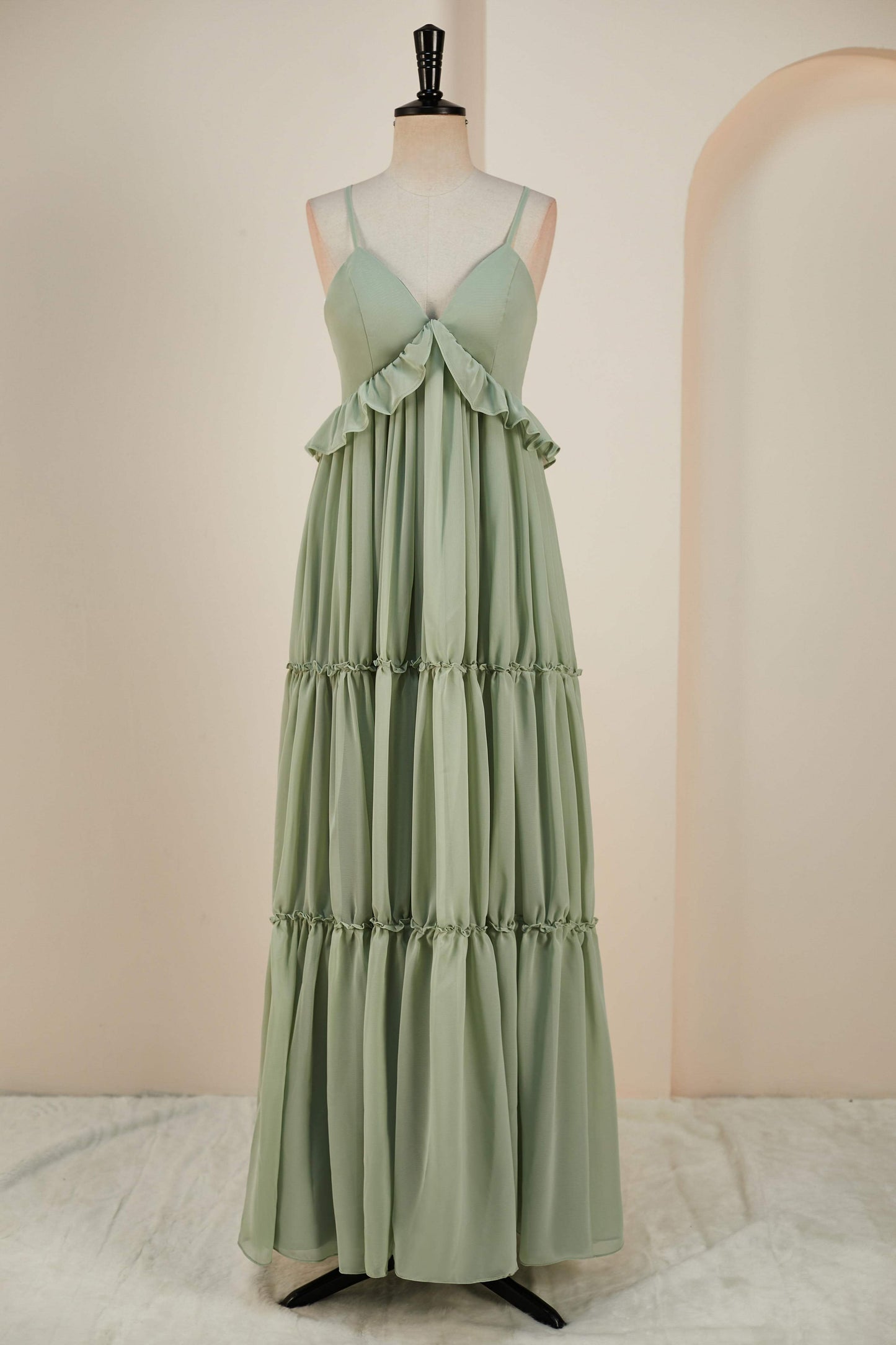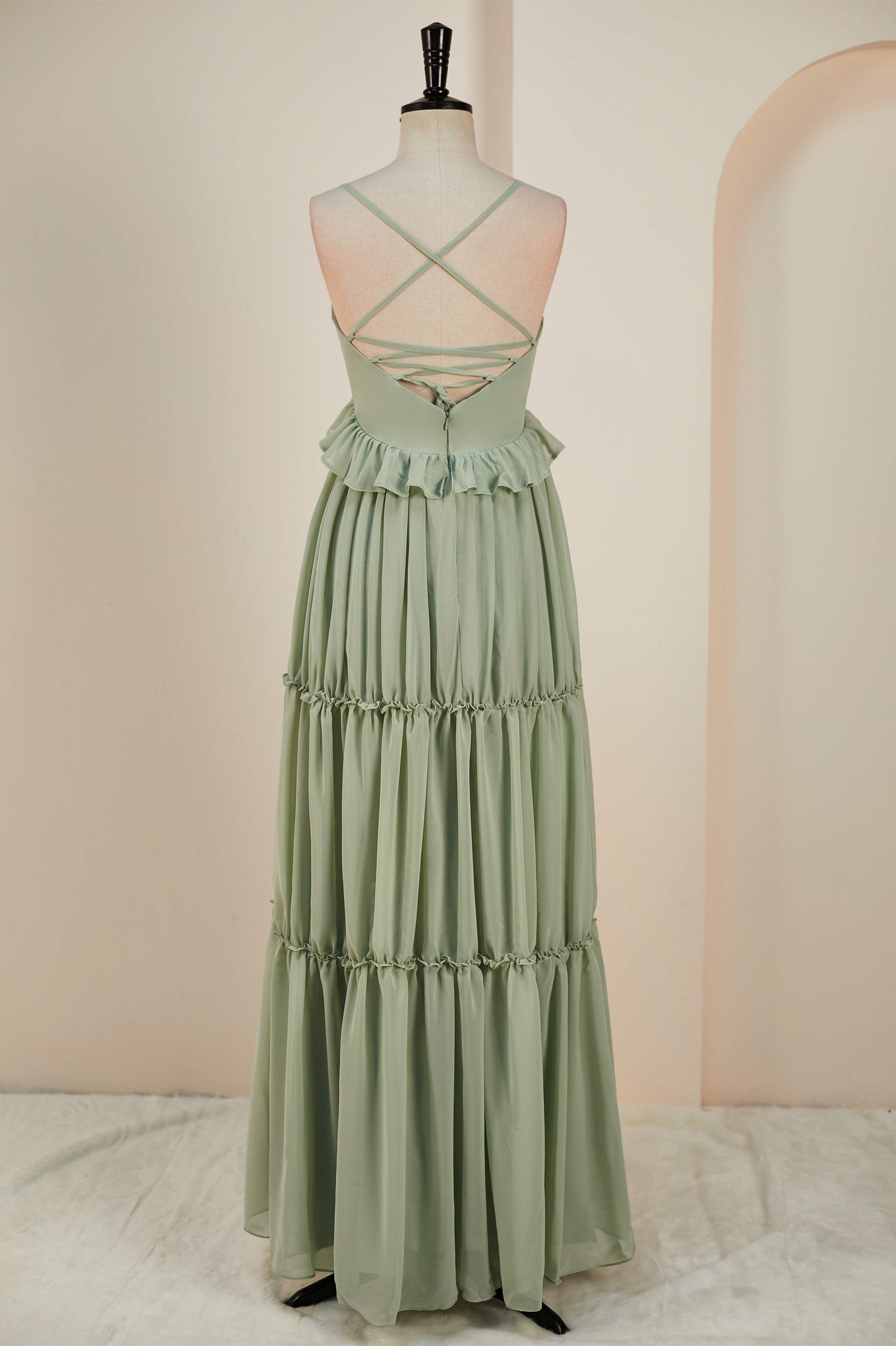 This dusty sage bridesmaid dress features a plunging V neckline with spaghetti straps which create a lace-up back detail, and an empire silhouette with ruffled top bodice, and a floor-length skirt with ruffled layers.