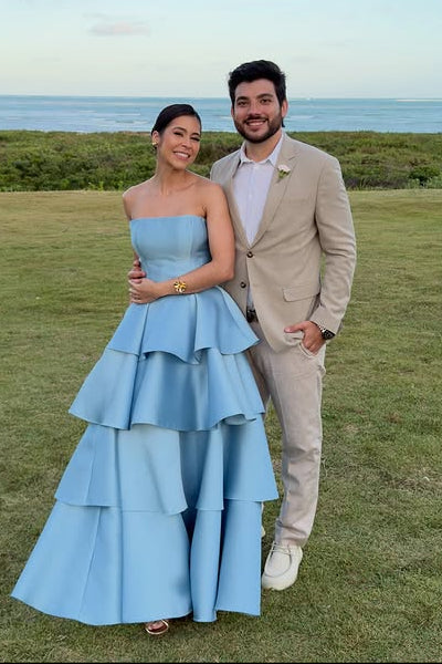 This elegant strapless party prom dress is crafted from luxurious satin, featuring a flattering empire waist that enhances the silhouette. Its A-line shape flows beautifully into tiered layers, adding depth and movement for a sophisticated look. Ideal for formal occasions, this dress combines classic design with refined details to ensure a graceful presence.