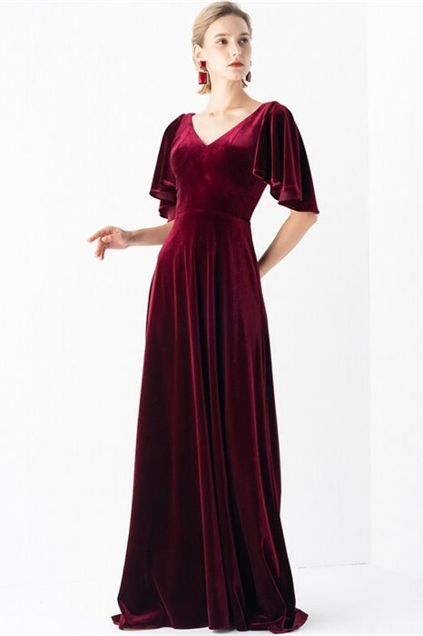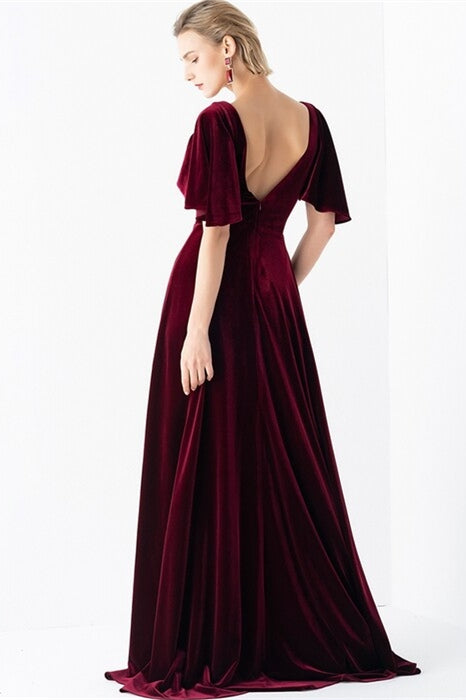 Joyofdress A-line burgundy velvet dress with flutter sleeves.