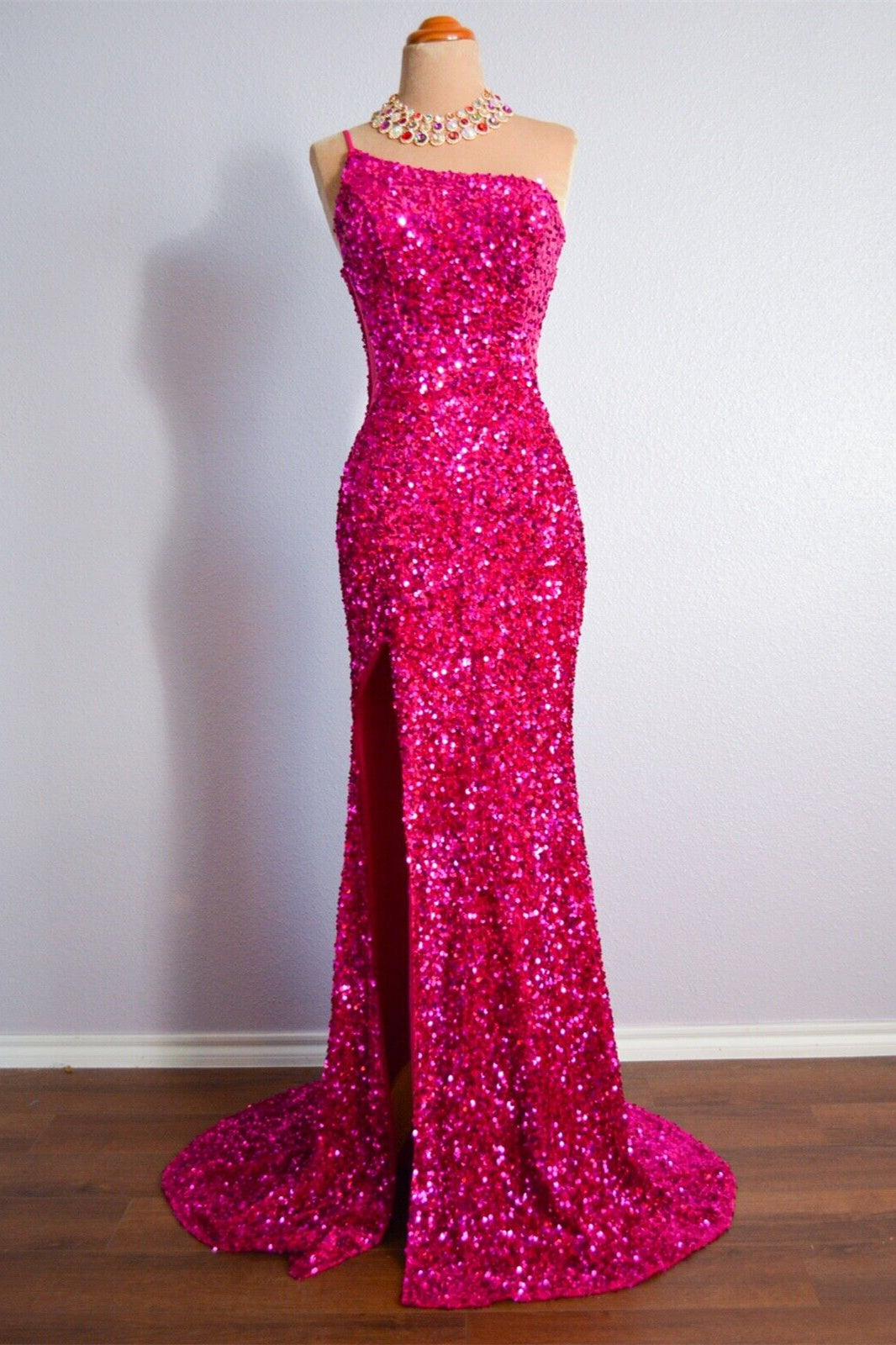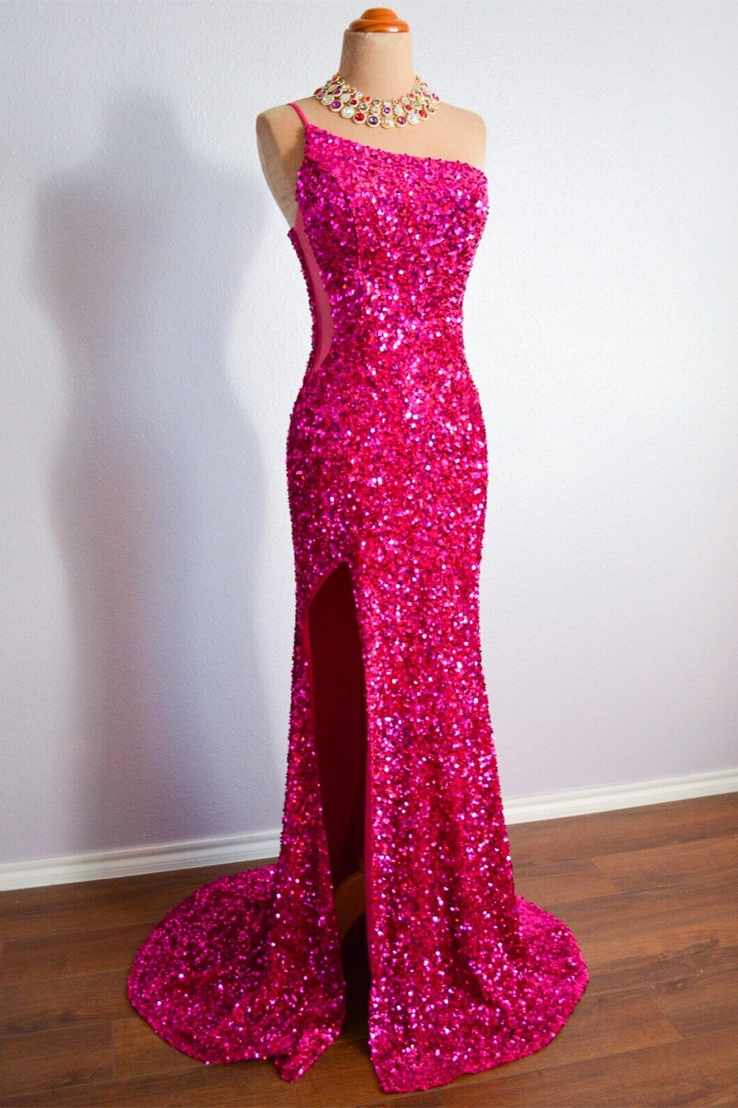 Make a stunning entrance in this one-shoulder mermaid silhouette designed for unforgettable evenings. The sleeveless cut showcases elegant lines while sequin detailing catches light with every movement, creating captivating shimmer throughout the night. The fitted mermaid shape flatters your figure before gracefully flaring at the hem, delivering that show-stopping dramatic effect. Perfect for prom, galas, or formal celebrations where you want to command attention. This dress combines sophisticated design with eye-catching sparkle for a truly memorable look.