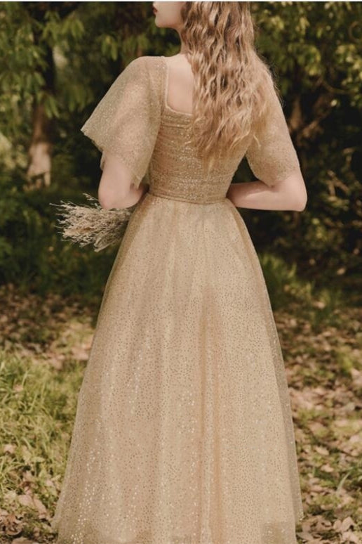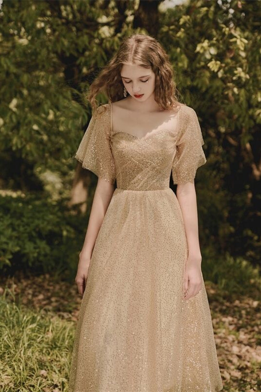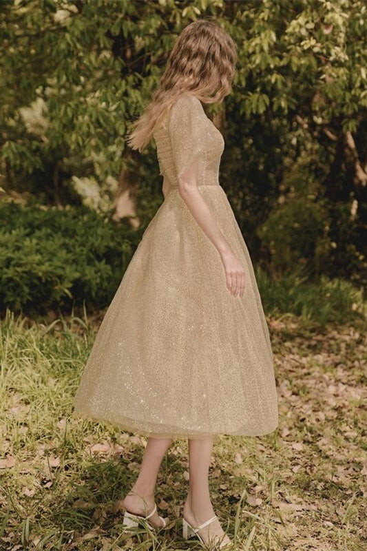 Gold Tea Length Dress with Flutter Sleeves