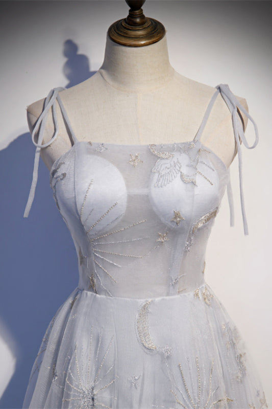 Grey A-line Bow Tie Shoulder Gold Embroidery Long Formal Dress
