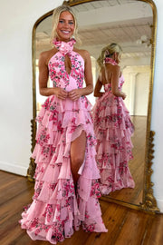 High Neck Backless A-Line Tiered Floral Party Prom Dress