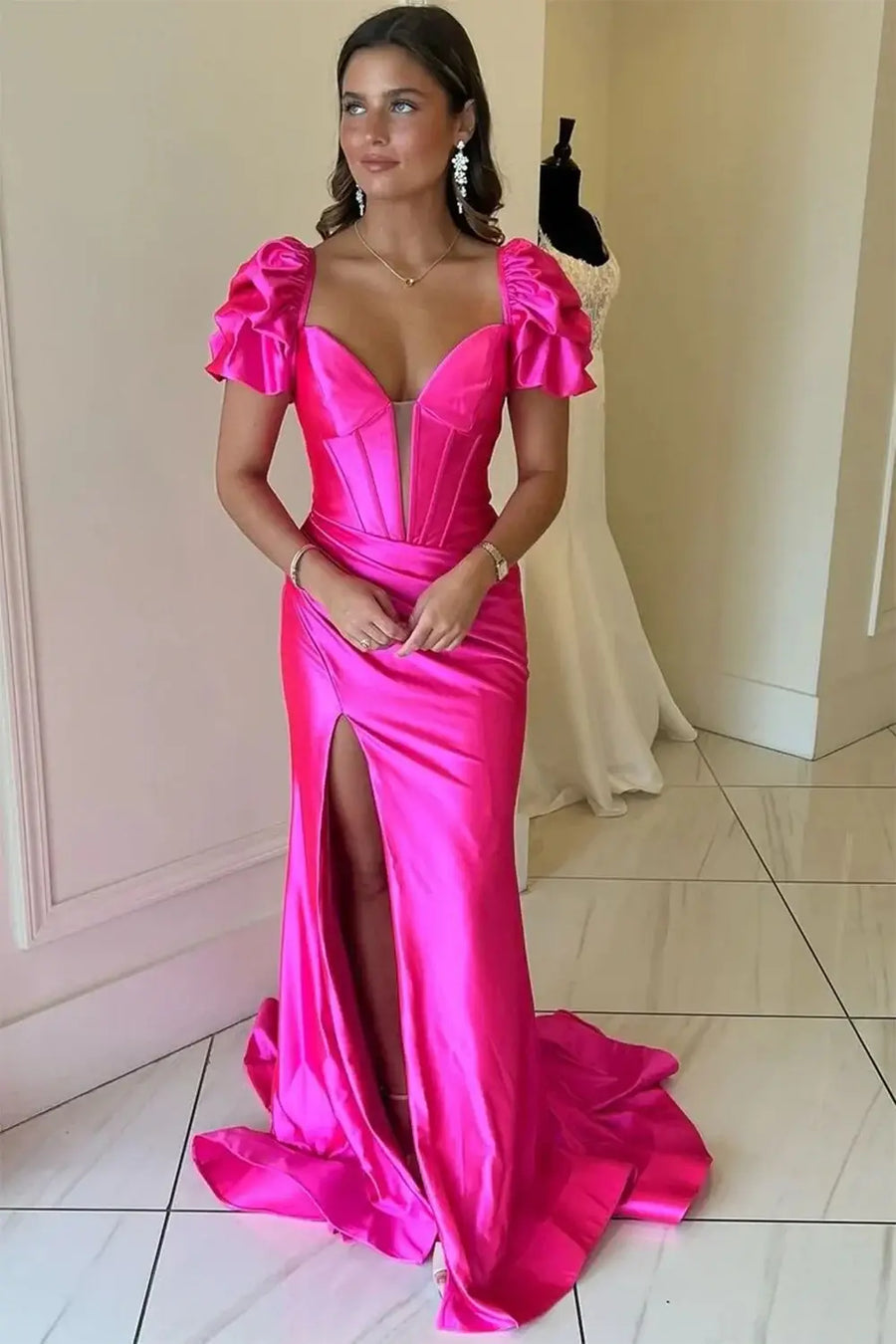 This Hot Pink Short Sleeves Mermaid Party Prom Dress With Train is a show-stopping choice for any special occasion. The eye-catching hot pink color is complemented by the mermaid silhouette and elegant short sleeves. The train adds a touch of...
