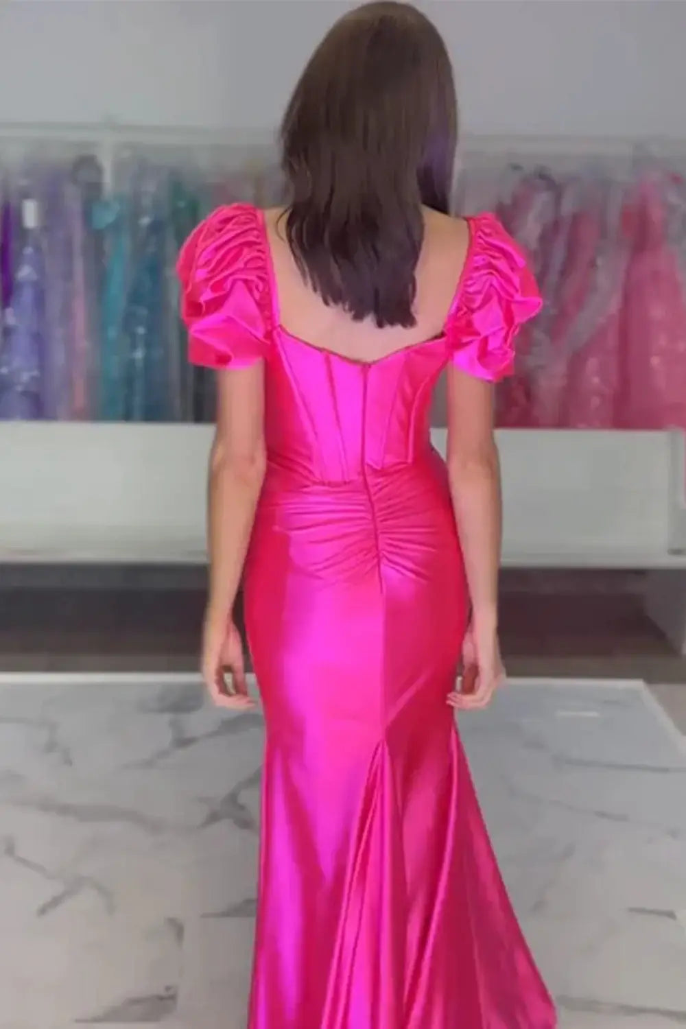 Hot Pink Short Sleeves Mermaid Party Prom Dress With Train