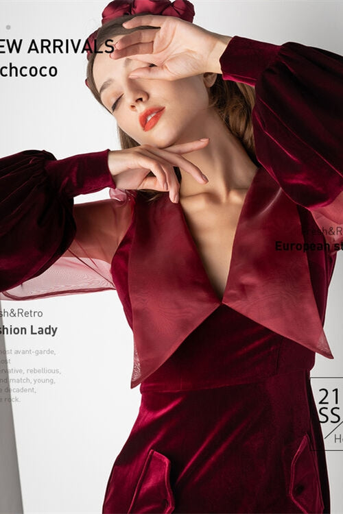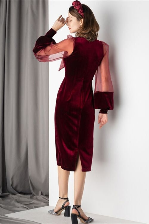 Illusion Long Sleeves Burgundy Velvet Midi Dress