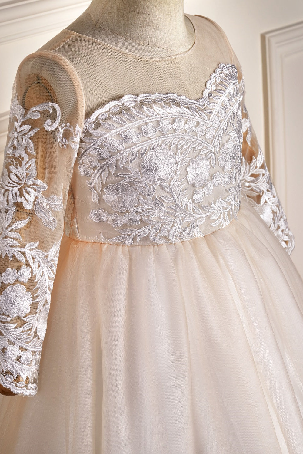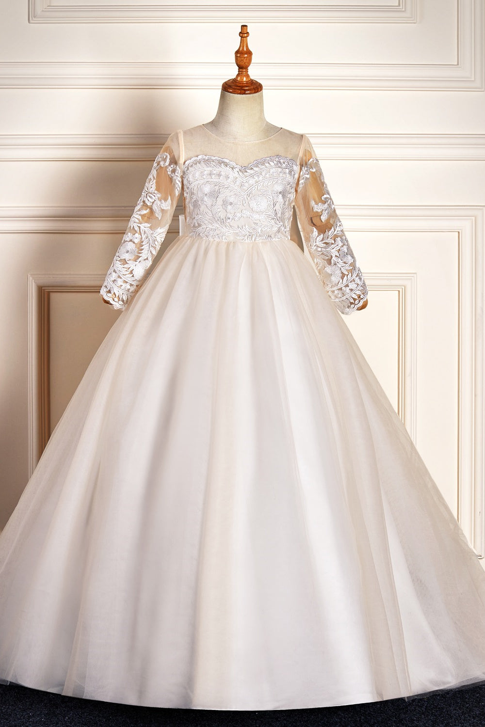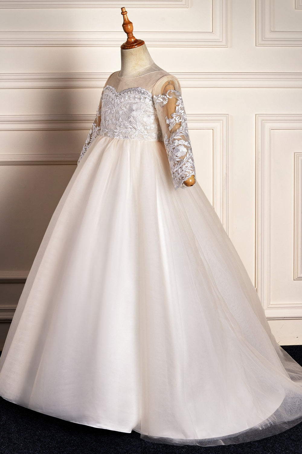 Ivory Long Sleeves Tulle Lace Long Flower Girl Dress