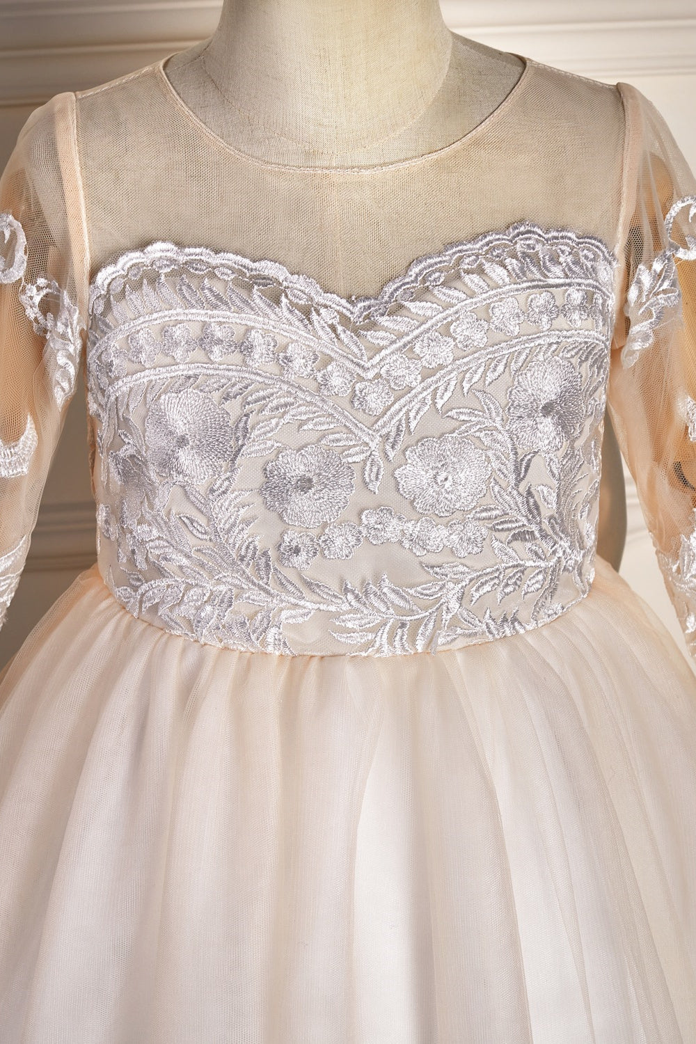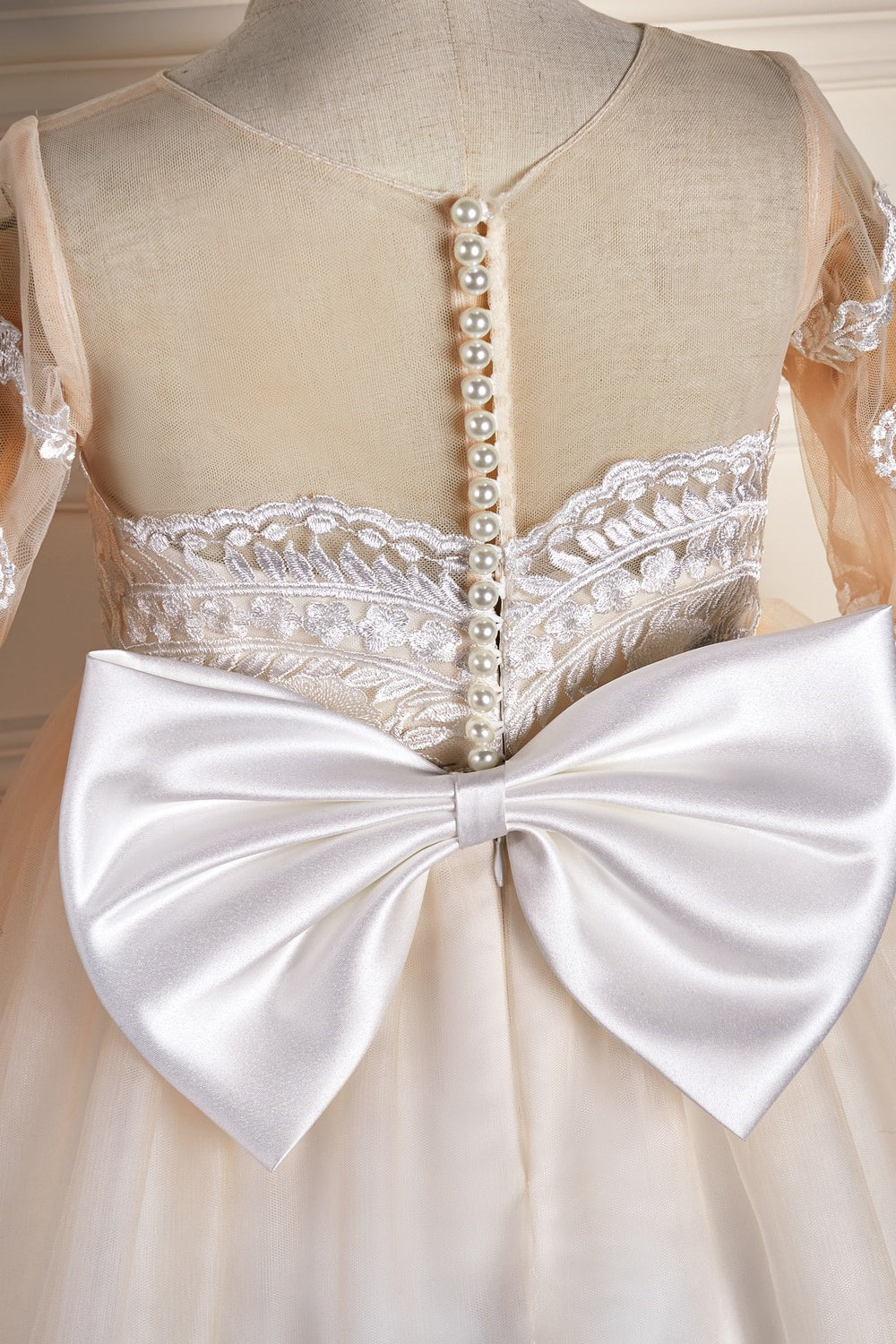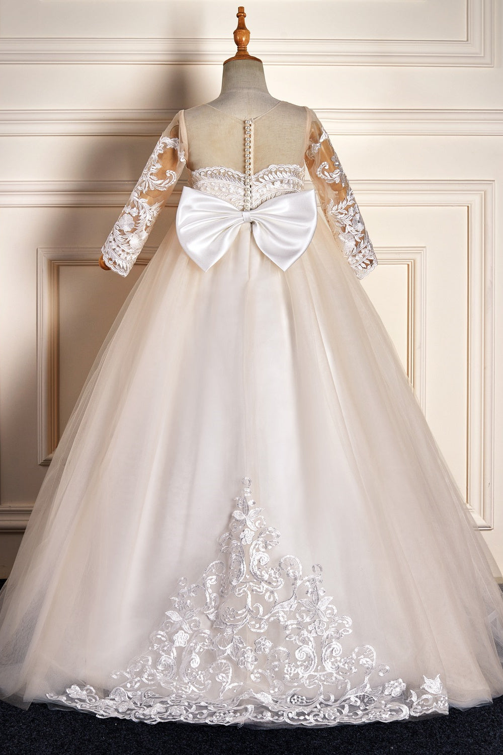 Ivory Long Sleeves Tulle Lace Long Flower Girl Dress