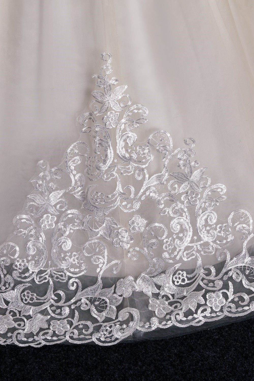 Feel delicate and elegant in this flower girl dress. It features an illusion sweetheart neckline with floral embroidered appliques on the long sleeves. The pear buttons' back closure and bow-back design add a special touch of elegance to the look. Triangle-shaped embroidered appliques, in the middle of the hemline, flow down to the short sweep train.