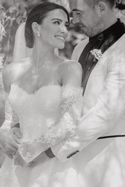 This refined wedding gown harmonizes classic elements with sophisticated craftsmanship. The sweetheart neckline creates a timeless frame that elegantly highlights the décolletage, while the strapless design offers architectural precision with clean lines. Intricate lace detailing provides dimensional texture and artisanal quality throughout the design. The A-line silhouette gracefully flows from the structured bodice, ensuring balanced proportions and effortless movement. The full-length construction extends to create a statuesque profile, perfect for formal ceremonies and processionals. This thoughtfully constructed gown balances the romantic intricacy of lace with the enduring elegance of a classic silhouette.