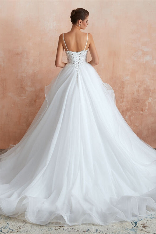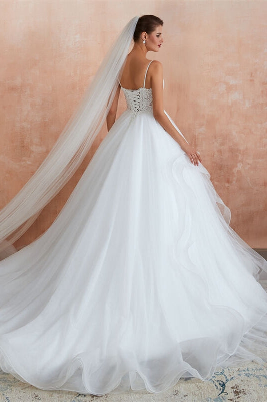 The Layered Wedding Gown is made for the woman who wants to feel elegant on her wedding day. Featuring spaghetti straps, a lace-up back, and a full lace appliques bodice, this gown has style elements you already know and love. The skirt features layered tulle and ruffles, making this dress the ideal mix of grace and femininity.