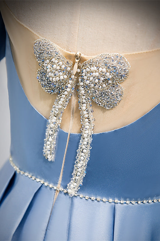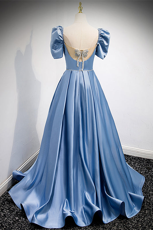 Light Blue A-line V Neck Puff Sleeves Beaded Bow Long Formal Dress