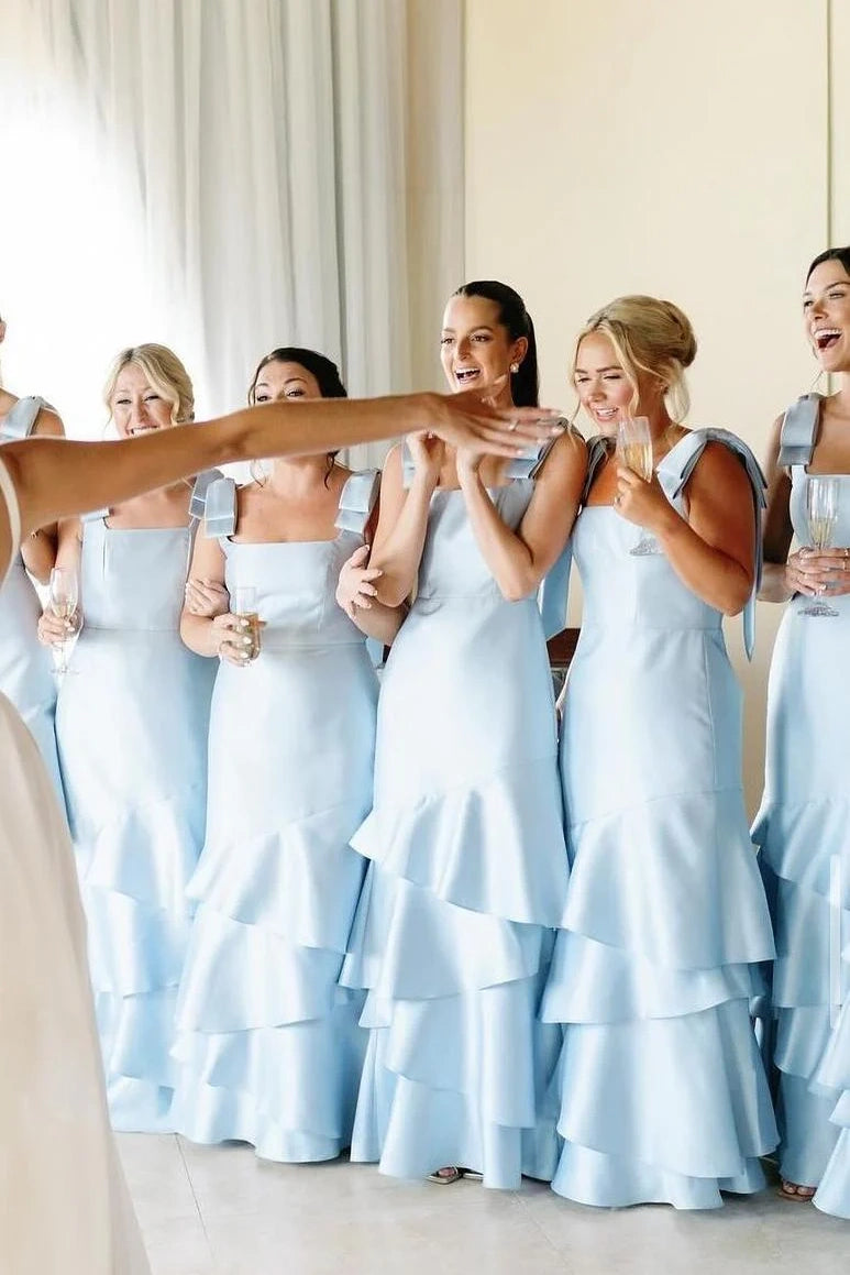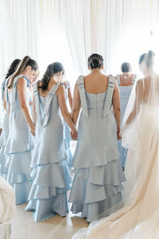 Light Blue Square Straps A-Line Tiered Bridesmaid Dress