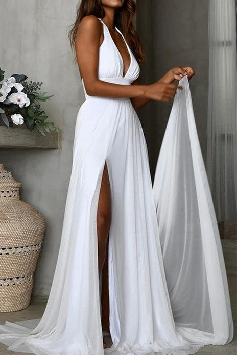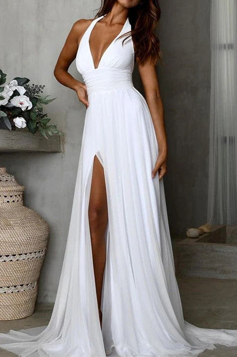 Low V-Neck Halter Backless Chiffon A-Line Wedding Dress