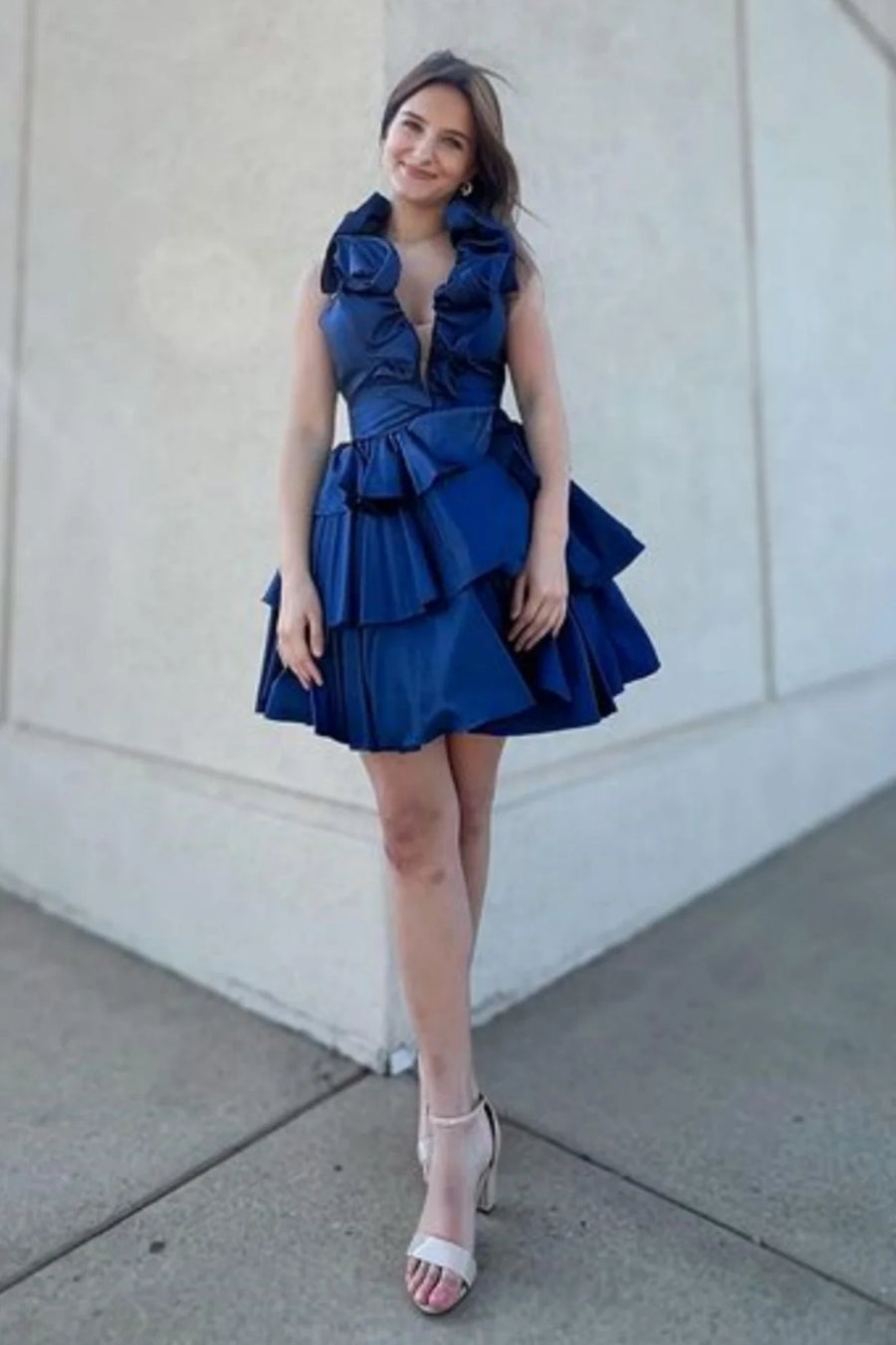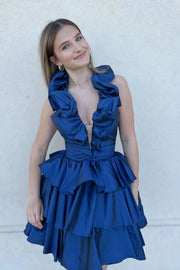 Low V-Neck Ruffled Halter Satin A-Line Tiered Homecoming Dress