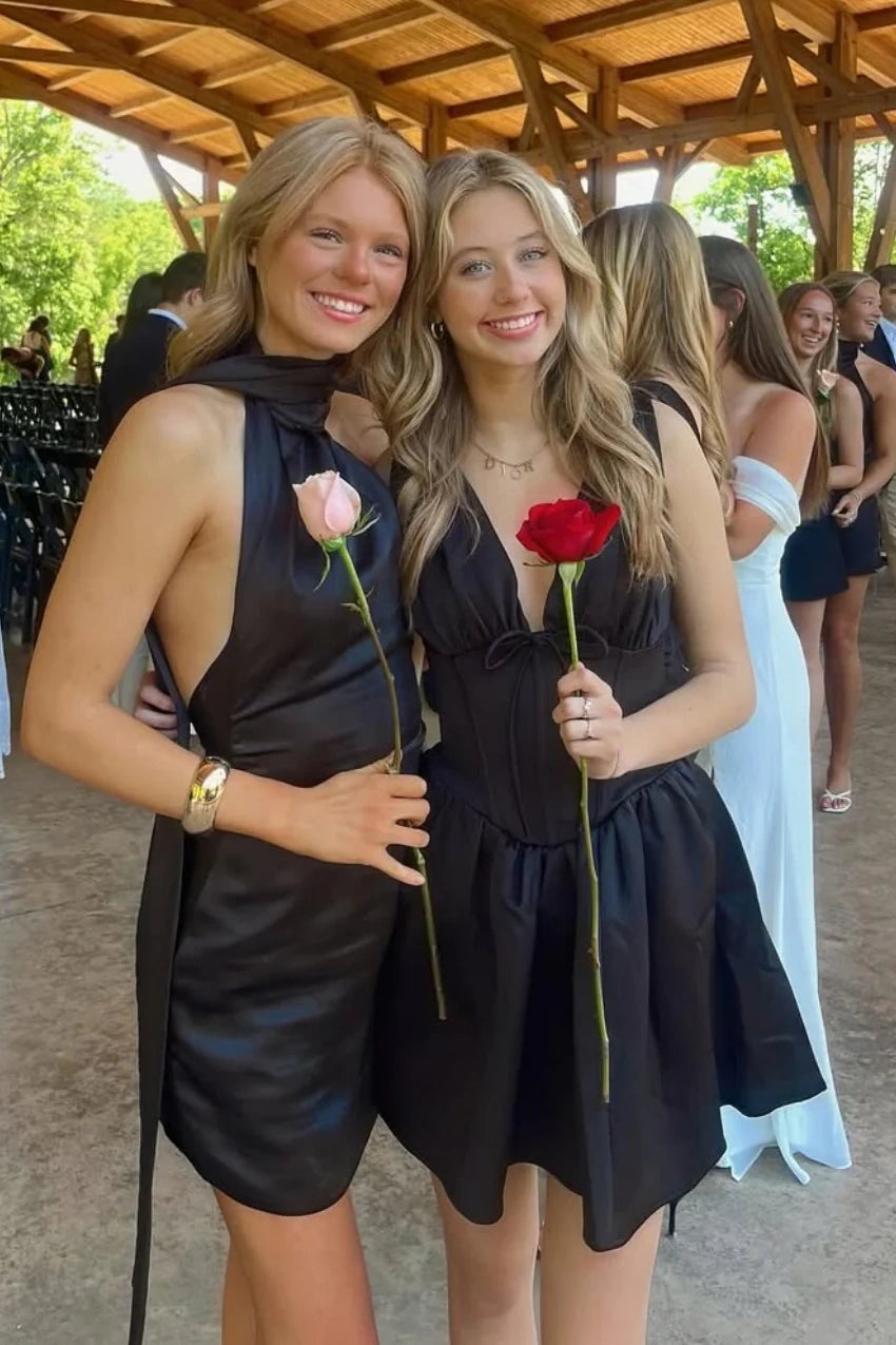 This satin homecoming dress features a low V-neckline and a sleeveless design, offering a sleek and elegant silhouette. The empire waist flows into an A-line skirt, providing a flattering shape that enhances comfort and ease of movement. Crafted from smooth satin, the dress delivers a subtle sheen and refined finish, making it an ideal choice for a sophisticated and timeless look at any special event.