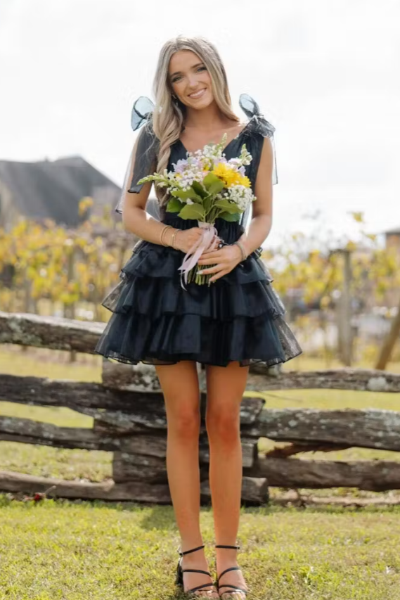 This elegant homecoming dress features a low V-neck and delicate straps that enhance its sophisticated silhouette. Crafted from soft tulle, the backless design adds a touch of allure, while the tiered A-line skirt creates graceful movement and volume. Perfect for making a memorable entrance, this dress combines classic style with modern details to ensure confidence and comfort throughout your special evening.