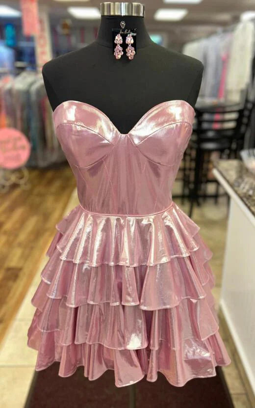 This Metallic Gold Corset A-Line Layered Short Homecoming Dress features a sweetheart neckline and corset bodice, providing structure and support. The ruffle-tiered skirt adds a fun and flirty touch to the overall look. Perfect for homecoming or any special occasion, this dress is sure to turn heads.