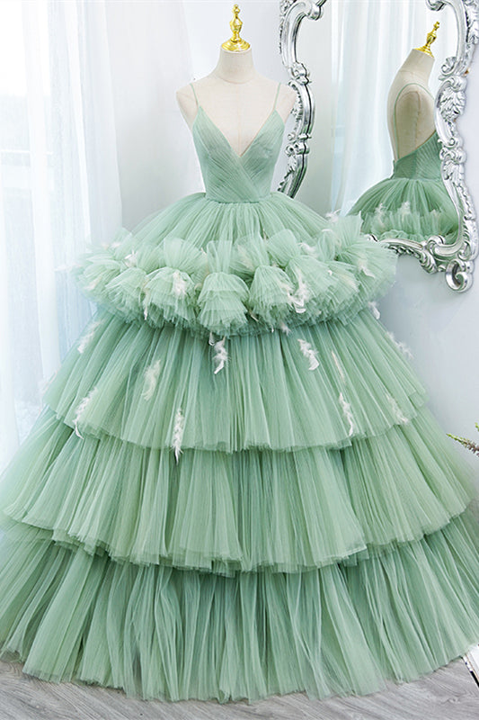 Mint Green Deep V Neck Pleated Straps Ruffle-Layers Maxi Formal Dress