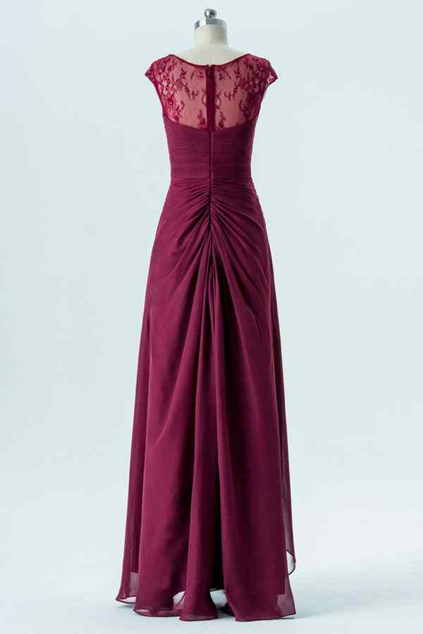 Mulberry V Neck Cap Sleeves A-line Pleated Chiffon Long Bridesmaid Dress