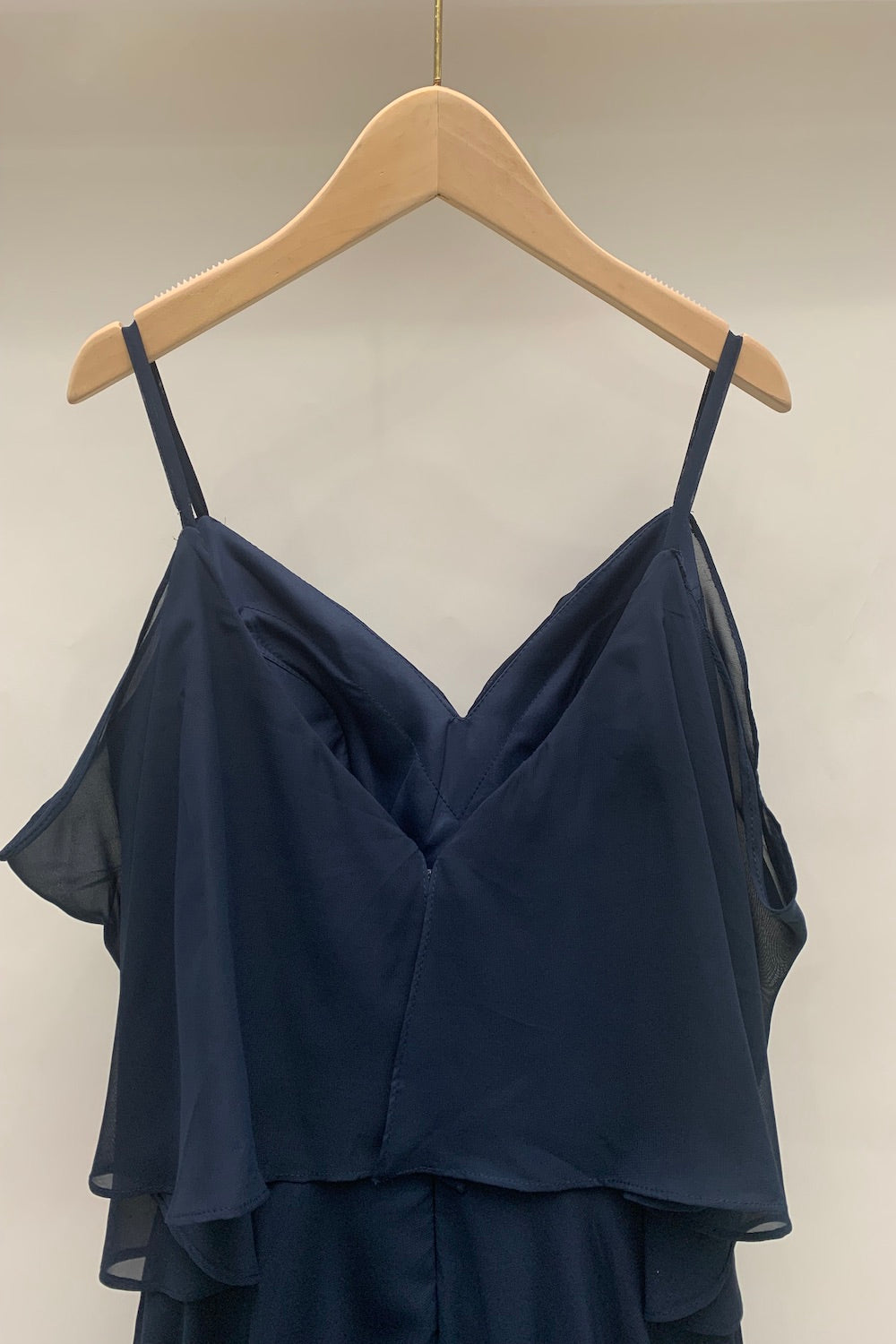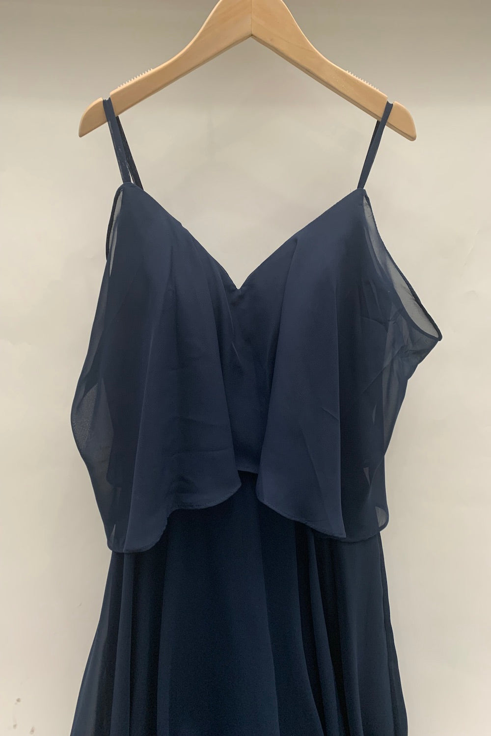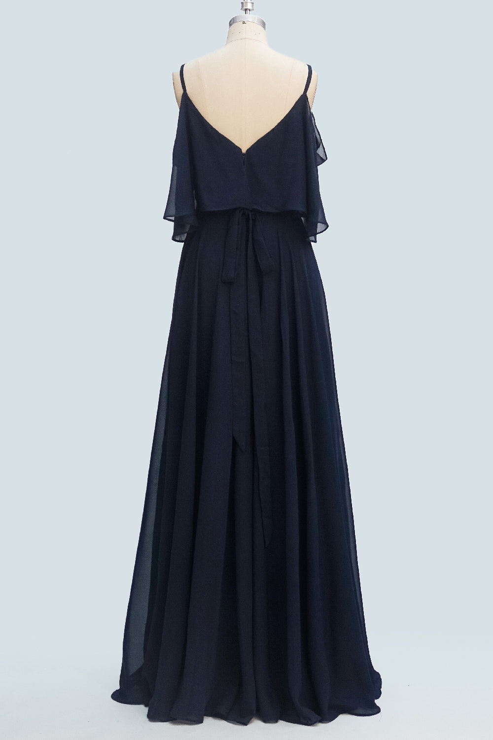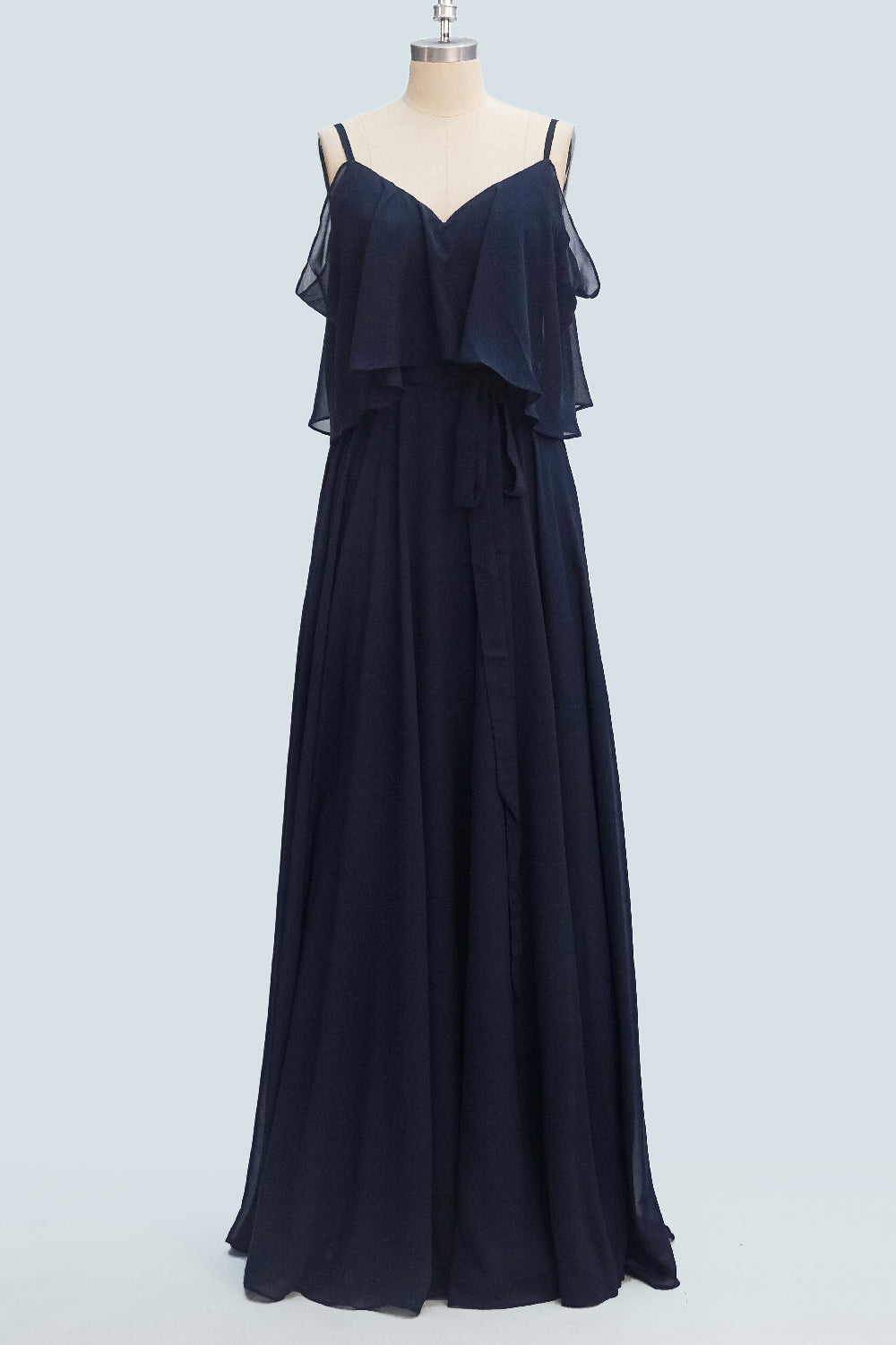 Navy Blue A-line Spaghetti Strap Sash Ruffle Long Bridesmaid Dress