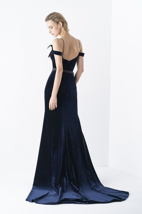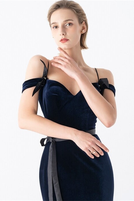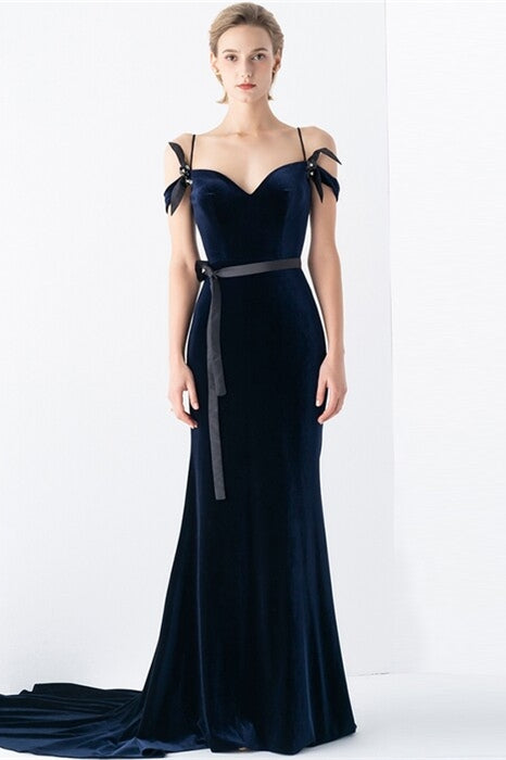 Joyofdress navy blue velvet mermaid long evening dress with off the shoulder neckline and sweep train.
