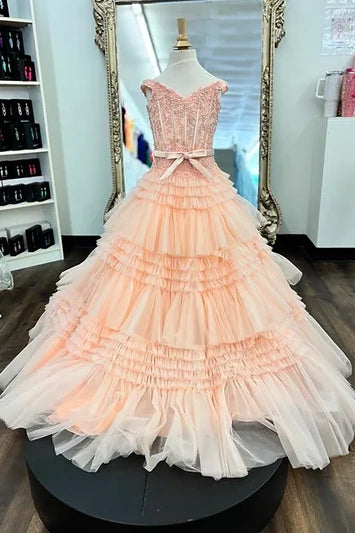 Expertly designed for the perfect pageant look, this Off-Shoulder A-Line dress boasts delicate tiered lace appliques for a stunning touch. With its graceful neckline and A-Line silhouette, your little girl will stand out in elegance and sophistication. Give her the confidence to shine on stage with this beautiful dress.