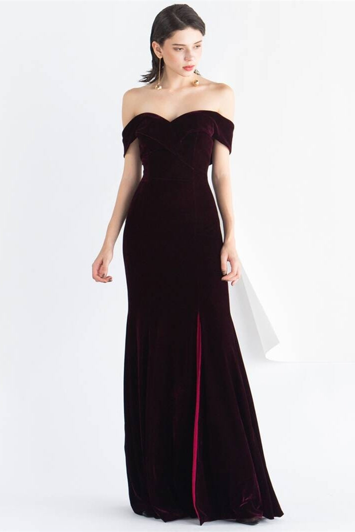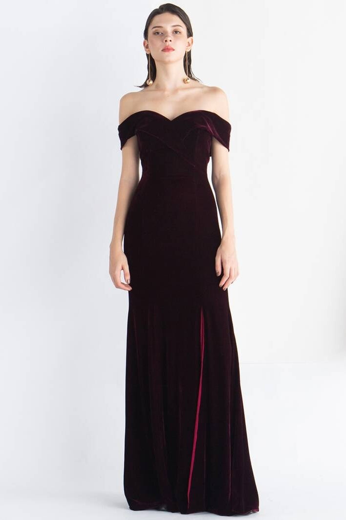 Off the Shoulder Burgundy Velvet Dress with Slit