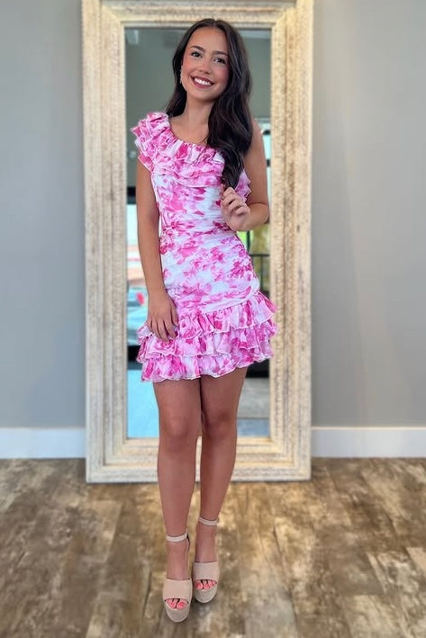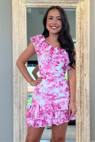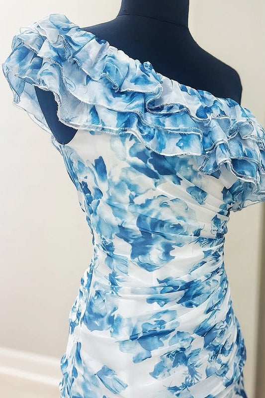 One Shoulder Ruffled Ruched Empire Floral Homecoming Dress