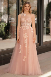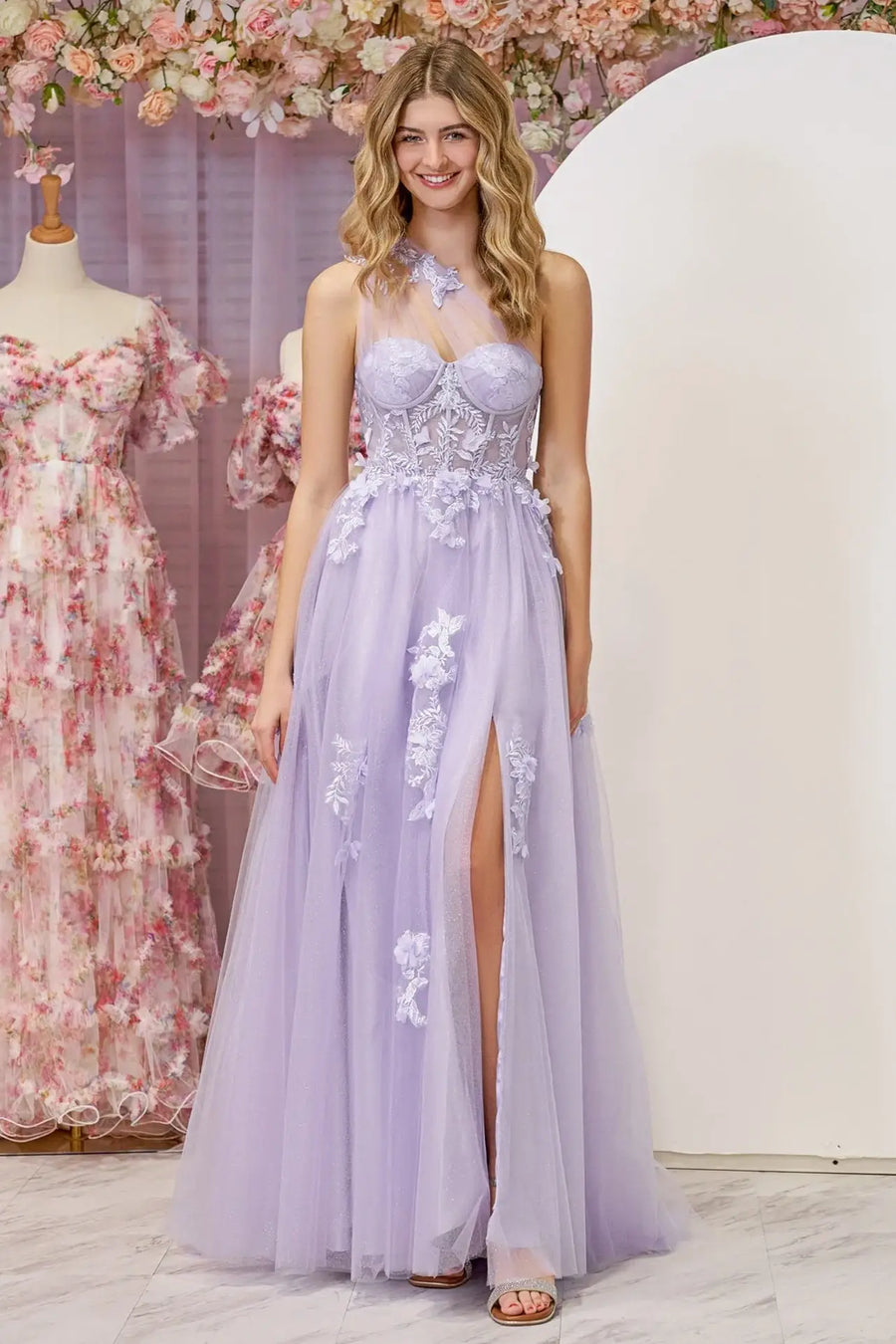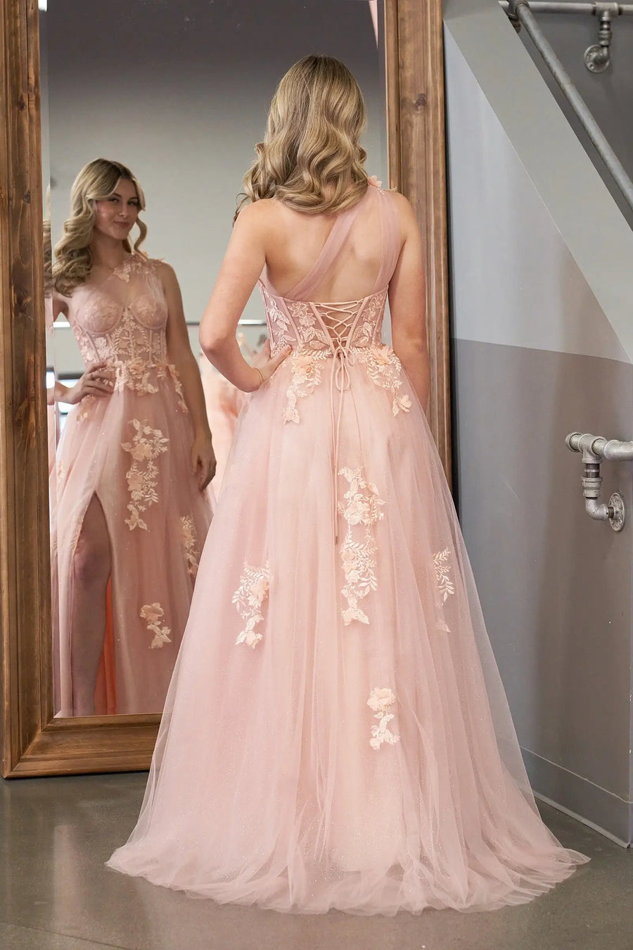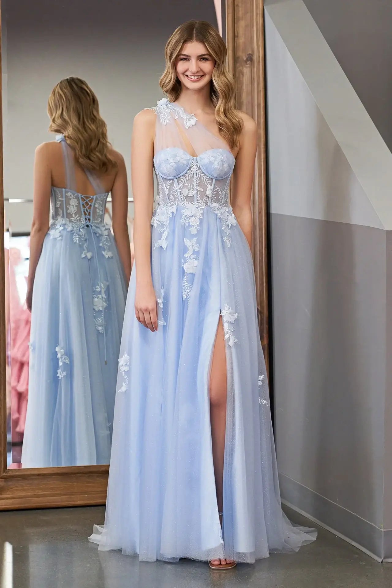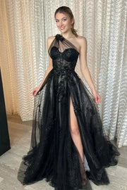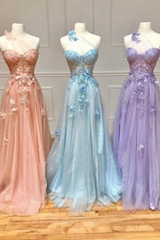 One Shoulder Sleeveless Tulle A-Line Florals Appliques Party Prom Dress