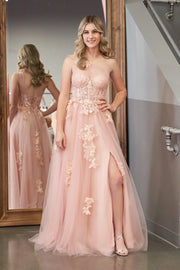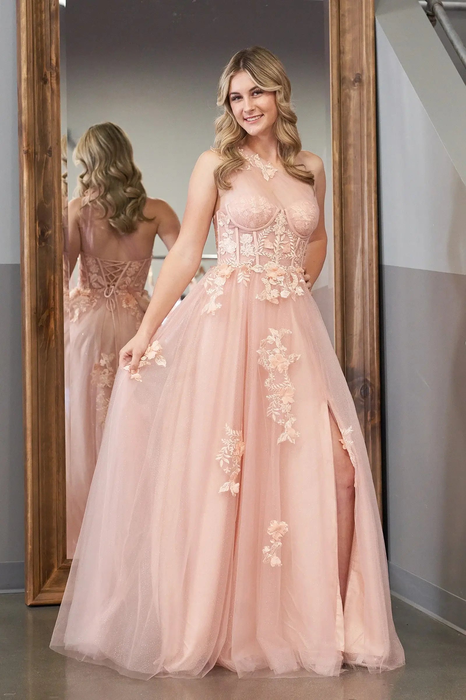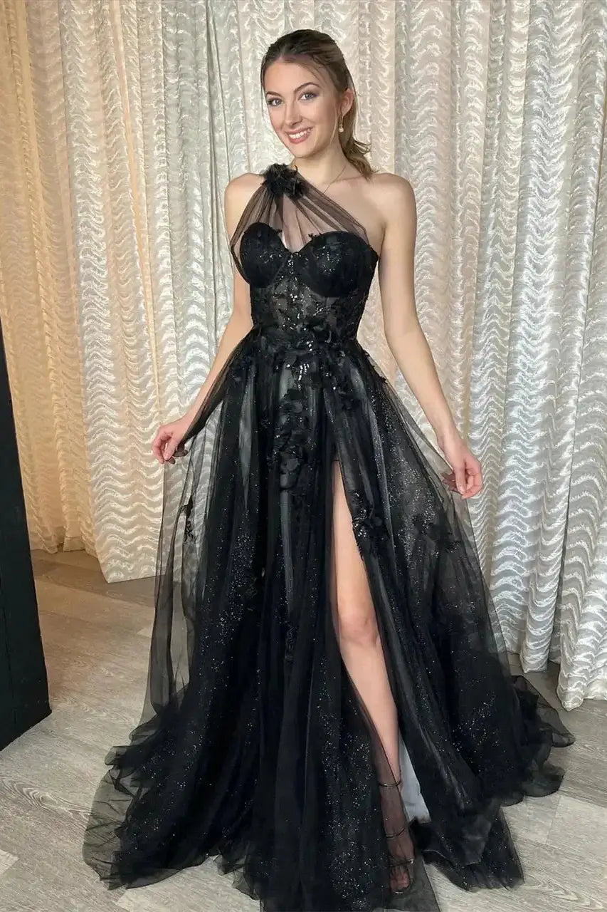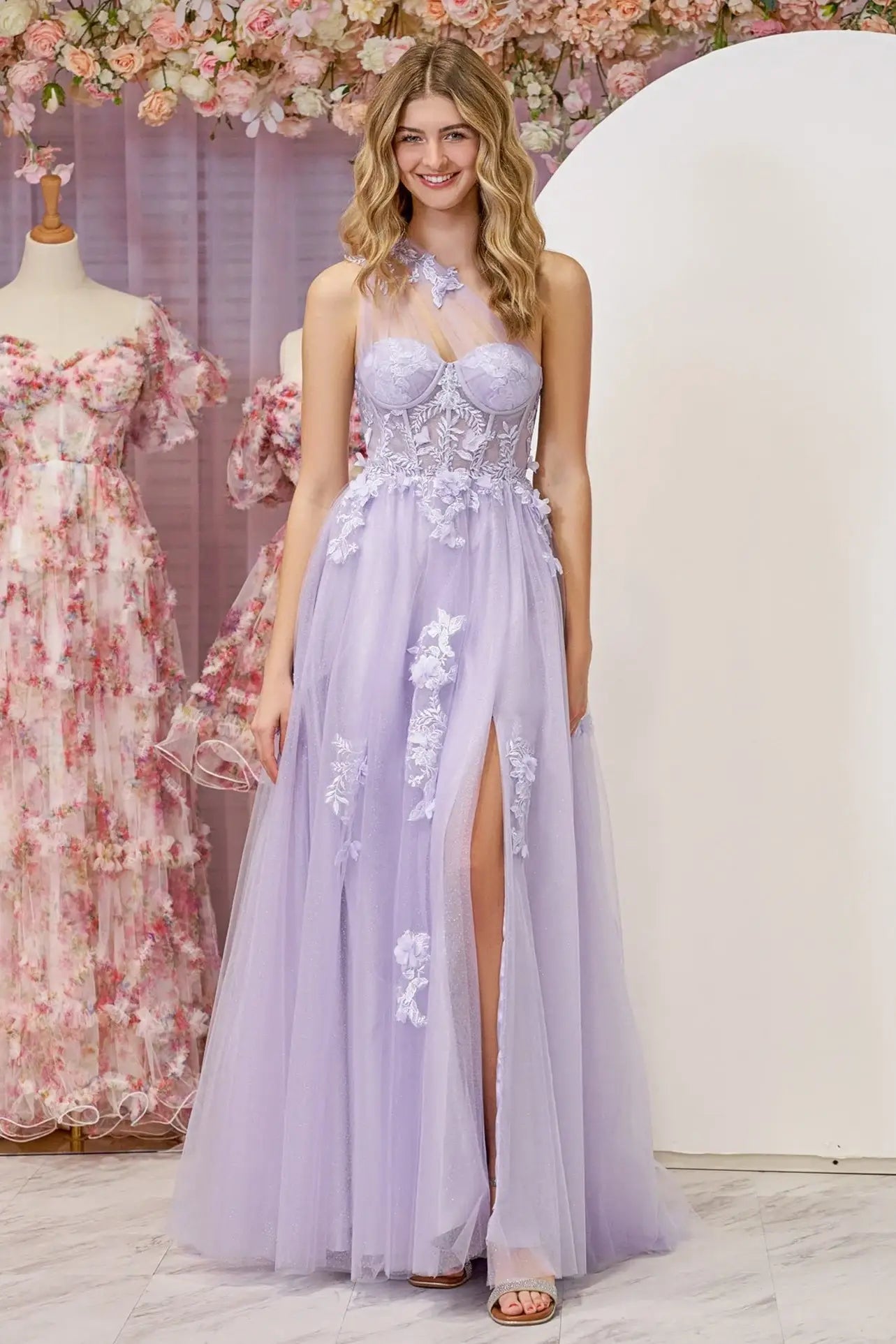 This elegant One Shoulder Sleeveless Tulle A-Line Dress features delicate florals appliques, creating a romantic and feminine look. The sleeveless design and A-line silhouette offer a flattering fit, making it perfect for any special occasion. Made with high-quality tulle fabric,...