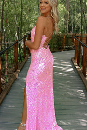Pink Bateau Sleeveless Lace Up Sequins Party Prom Dress With Slit