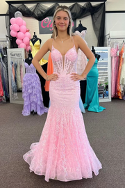 Pink Mermaid V-Neck Sleeveless Appliques Party Prom Dress