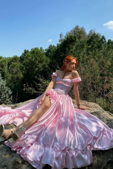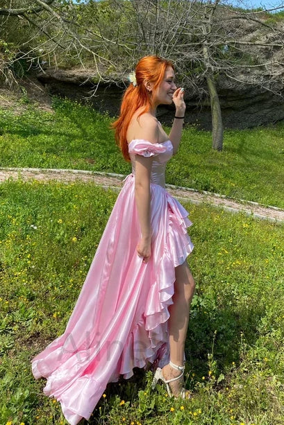 Pink Off-Shoulder Satin A-Line Ruffled High Low Party Prom Dress