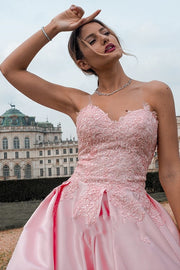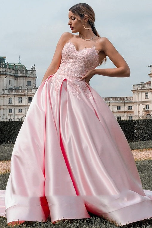 Pink Satin A-Line Lace Appliques Sweetheart Strapless Prom Dress