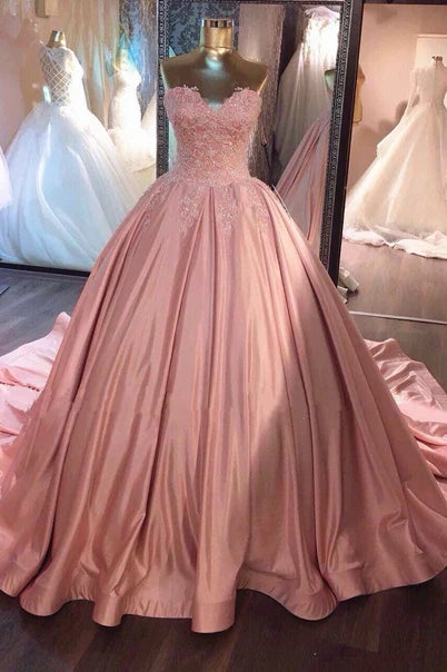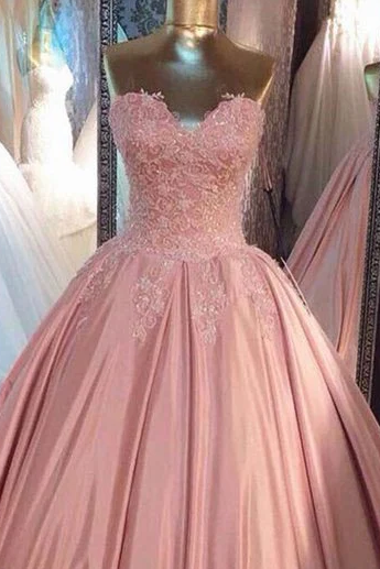 This exquisite pink satin gown harmonizes structural precision with delicate artistry. The A-line silhouette provides a universally flattering shape, while intricate lace appliques create dimensional texture against the luminous fabric. The sweetheart neckline frames the décolletage with timeless elegance, and the strapless design showcases shoulders with sophisticated restraint. Engineered for both visual impact and comfortable wear throughout formal events, this dress embodies refined femininity for proms and gala occasions.