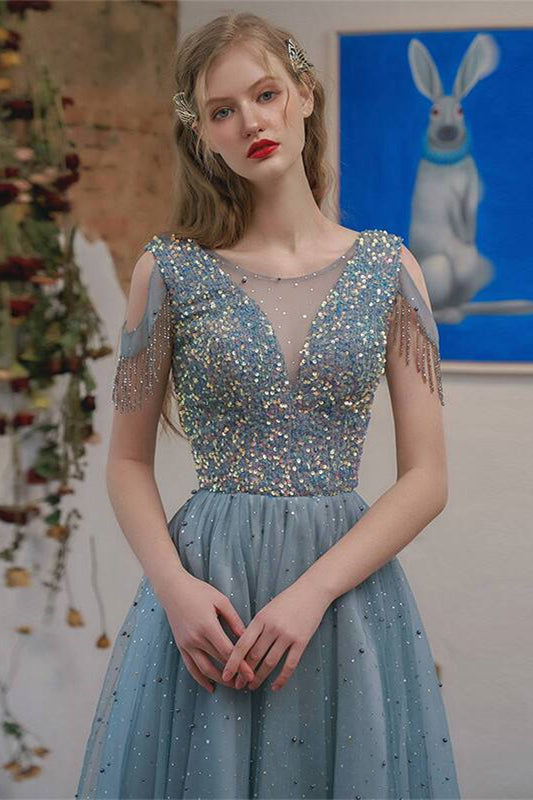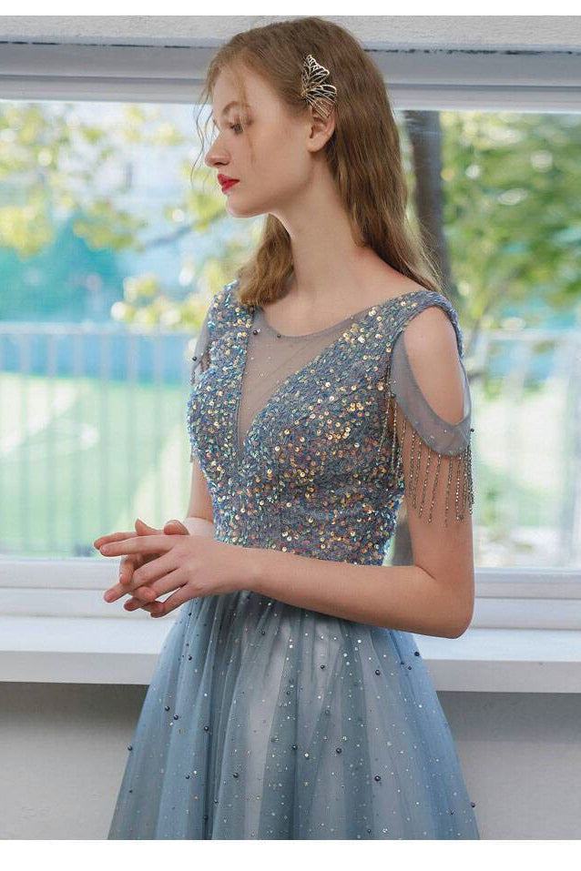 Princess Dusty Blue Illusion Neck Beading Party Dress
