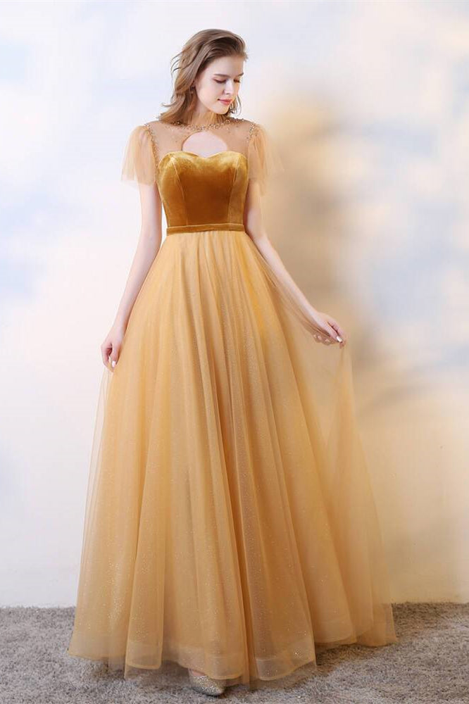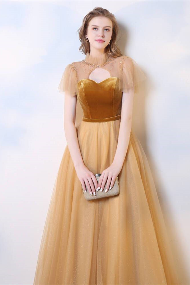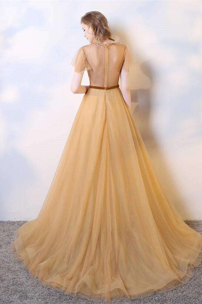 Joyofdress this A-line silhouette dress features an illusion ruffled high neck and flaunting sleeves with beaded detail a corset bodice with a sweetheart and a cut-out detail, and a floor-length skirt with a sweeping train.