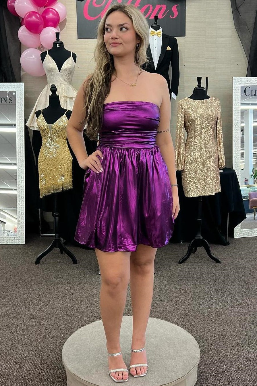 This striking purple satin homecoming dress combines timeless elegance with contemporary design elements. The strapless silhouette creates a sophisticated canvas that highlights the décolletage, while the A-line cut provides a universally flattering shape that moves gracefully. The distinctive lace-up back detail offers both aesthetic appeal and customizable fit, ensuring optimal comfort and support throughout your event. The rich purple satin fabric provides subtle luminosity that catches the light with each movement, making this an exceptional choice for homecoming celebrations where distinctive style is essential.