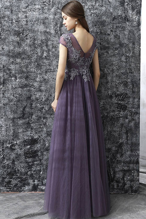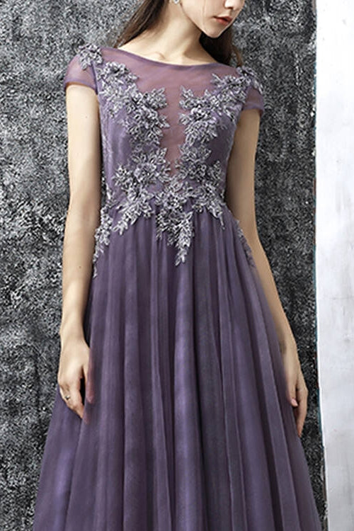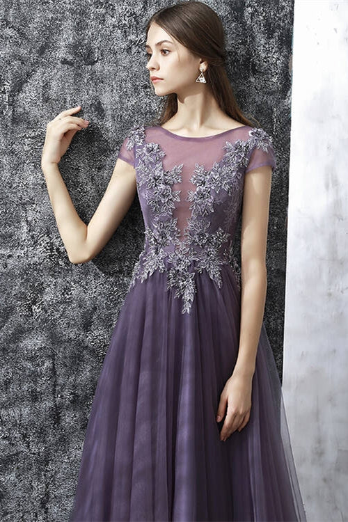 Purple Tulle Long Evening Dress with Cap Sleeves