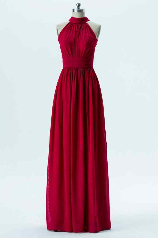 Joyofdress this A-line silhouette long dress features a halter neckline that has straps tied to a bow on the back, a pleated corset bodice and a gathering skirt with flare at the hemline. You will never be unnoticed in this red floor-length bridesmaid dress.