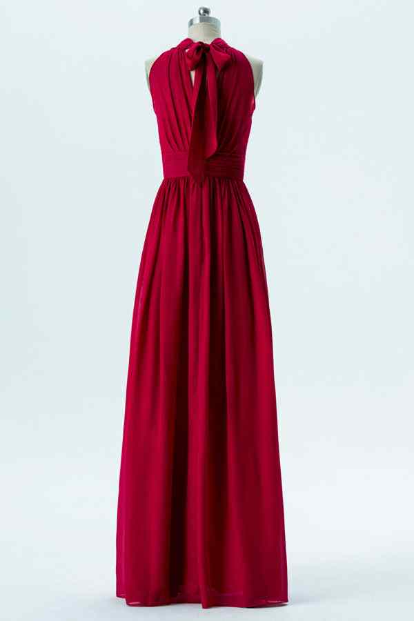 Red A-line Bow Tie Back Pleated Chiffon Long Bridesmaid Dress